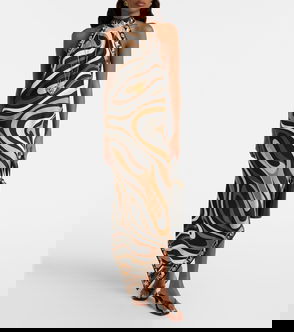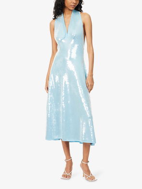 V-neck midi dress crafted from cotton, featuring a halterneck with no fastening and a lined top half.