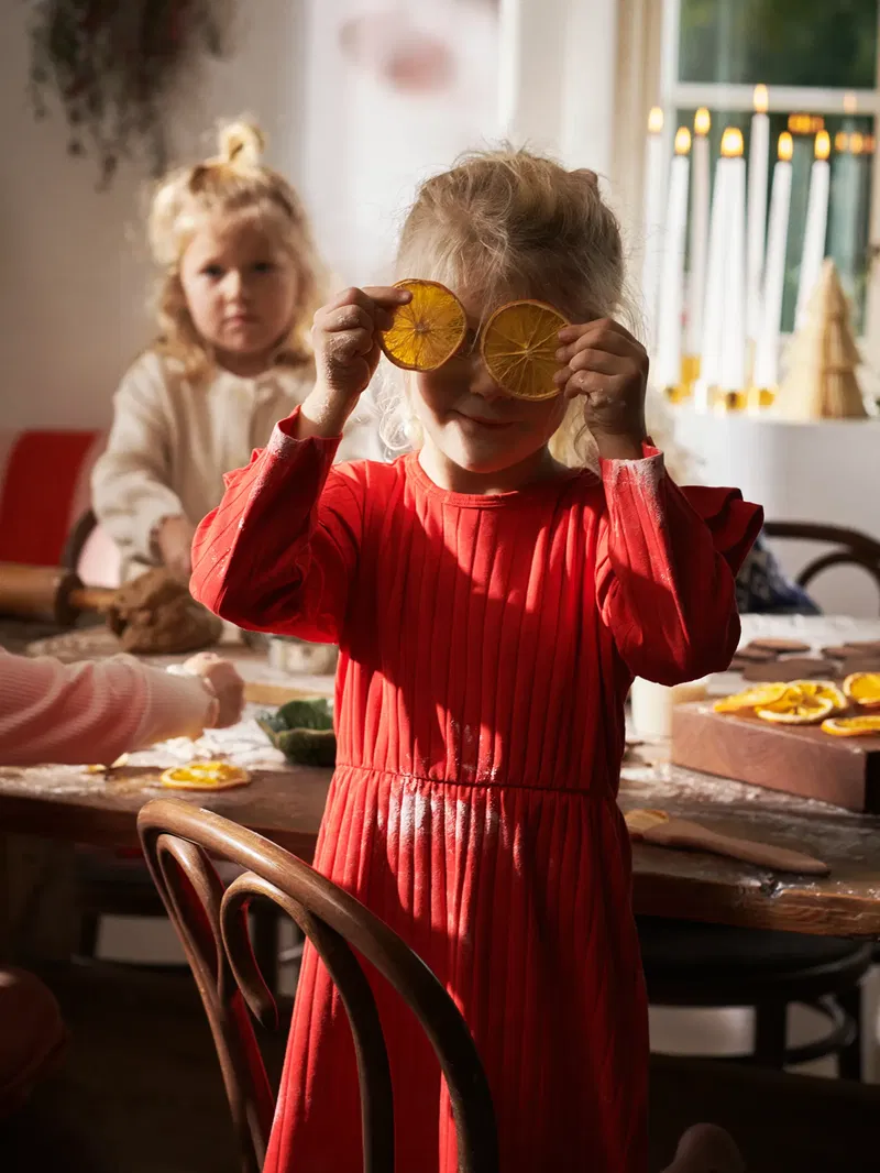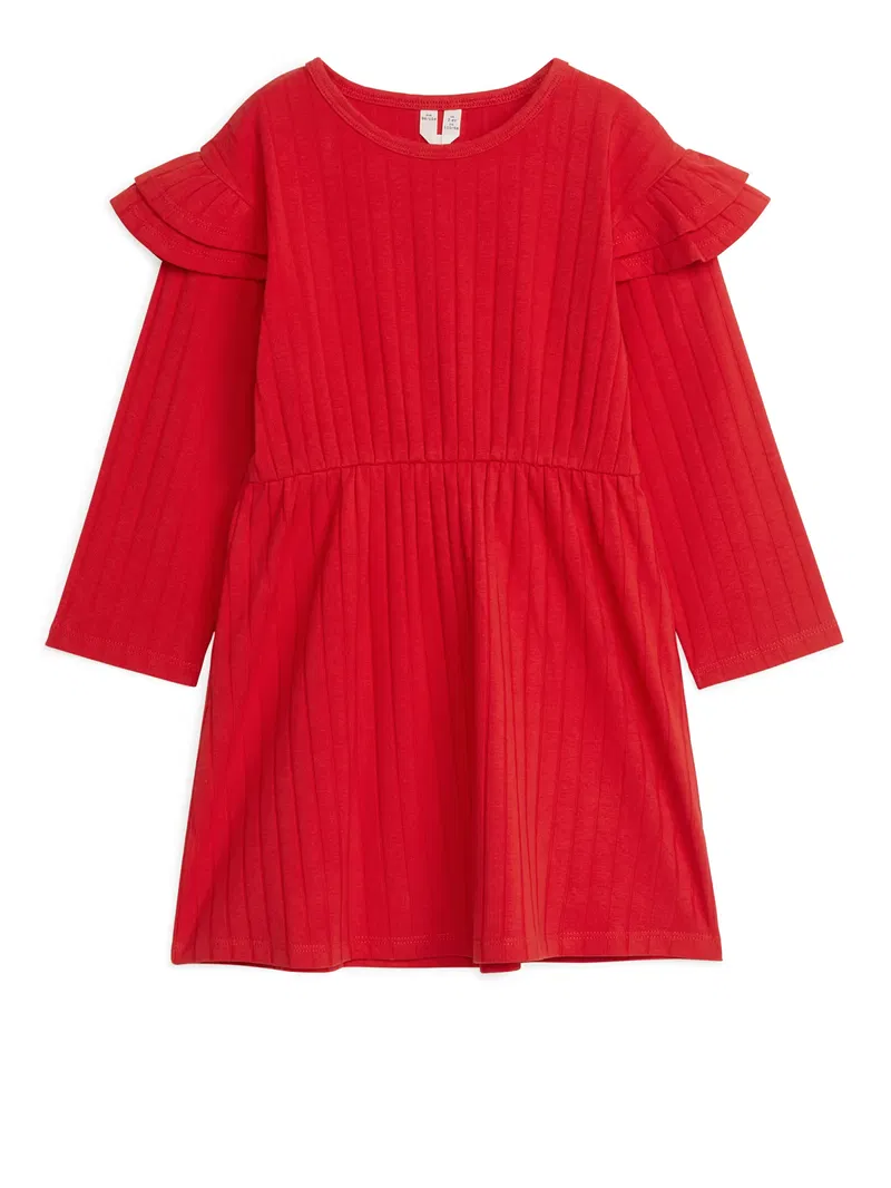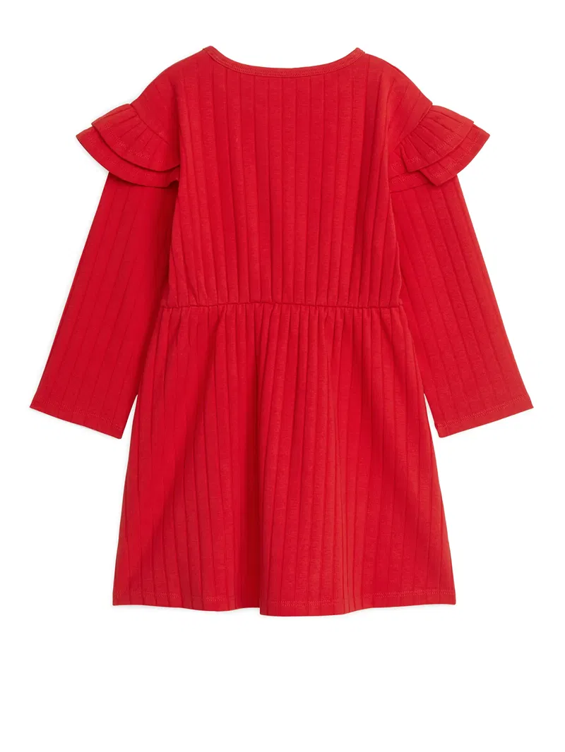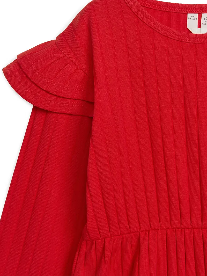 Dress in a rib-knit made of organic cotton with a hint of stretch. This mid-length dress features long sleeves with frills on shoulders.