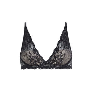 Crafted from a delicate floral lace, this wire bra offers a semi sheer coverage. The lace is made from recycled polyamide with a portion of virgin polyamide and elastane added. The bra is designed with slender adjustable shoulder straps and back closure with a single row of hook and eye.