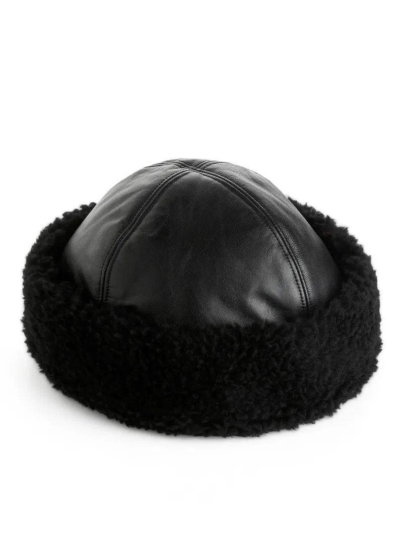 Warming hat in chrome-free leather with a turn-up brim in soft pile fabric. This is a four-panel, lined style.
