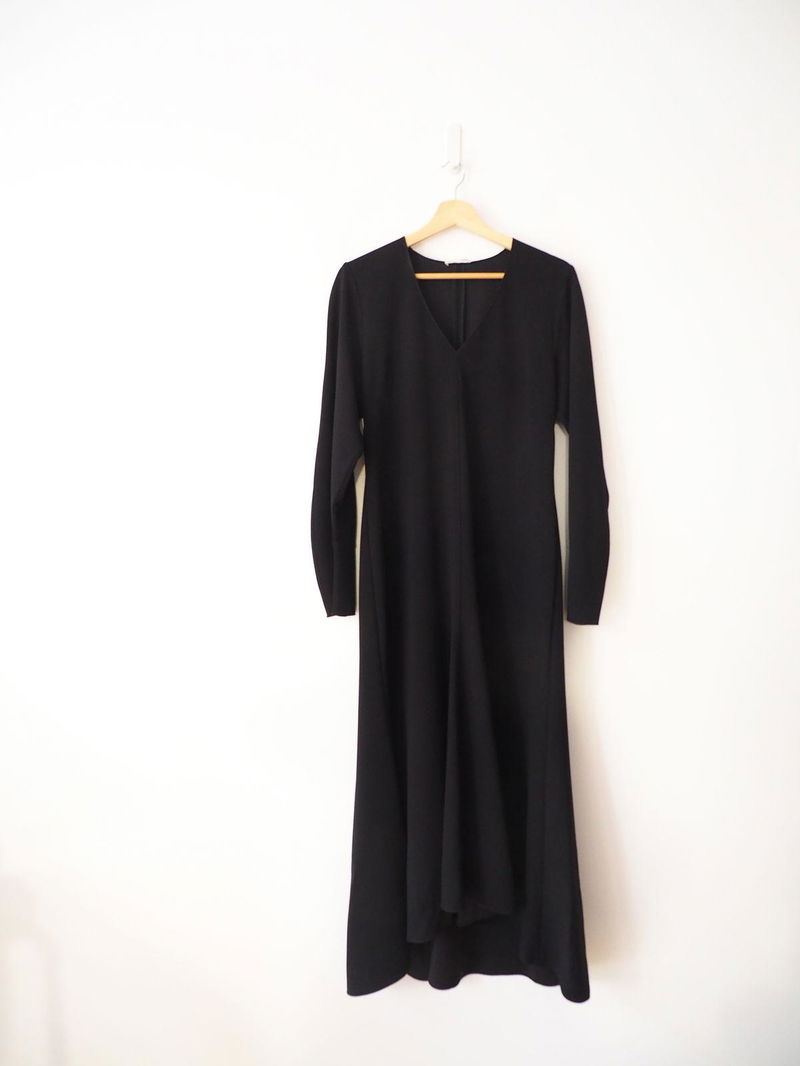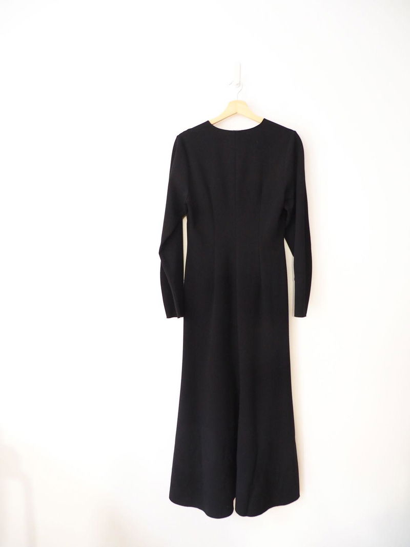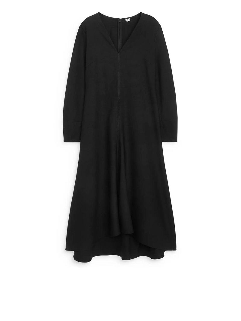 Mid-length dress with a flared silhouette crafted from a wool-blend. Detailed with darts near cuffs to create a slightly rounded sleeve shape and darts at bust. Cut seams at centre front and back. Concealed zip at centre back.