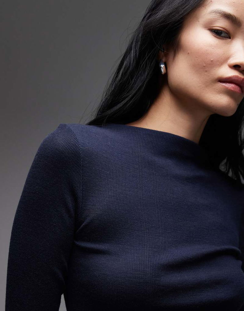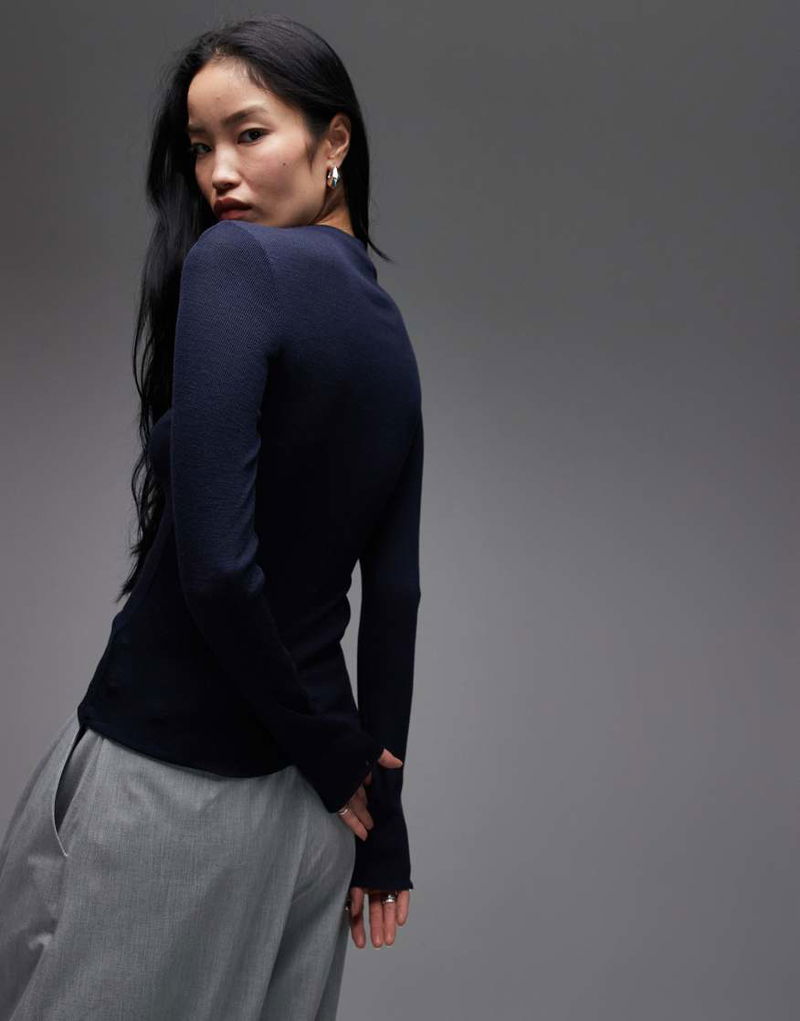 Merino Wool Knitted Semi Sheer Wide Rib Mock Neck Top In Blue