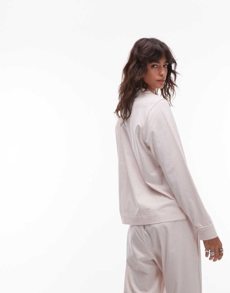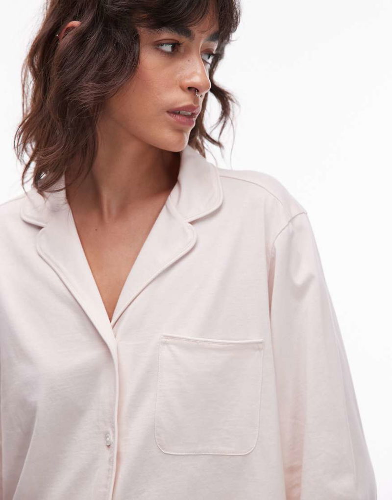 Mix And Match Cotton Long Sleeve Button Up Pyjama Top With White Contrast Piping In Beige