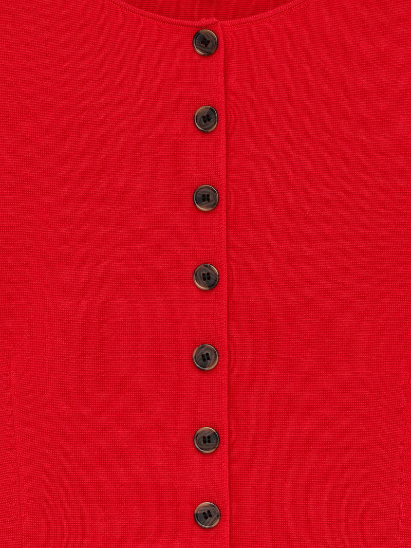 Cardigan with a fitted waist and button fastening. The shell fabric is made from 100% NATIVARegen™ wool certified by the NATIVA™ Protocol.