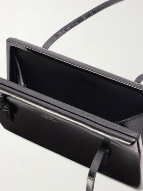Large tote bag in patent leather that has undergone a chrome-free tanning process. Features a magnetic closure, an internal zip pocket, and cotton lining.