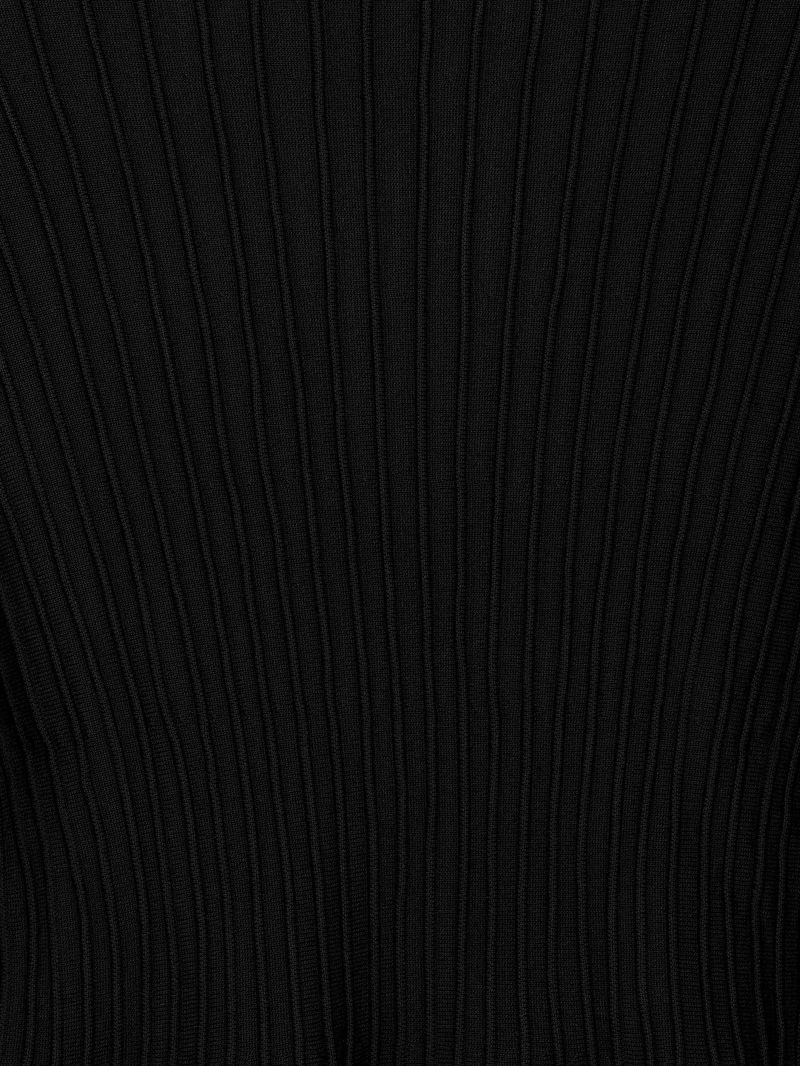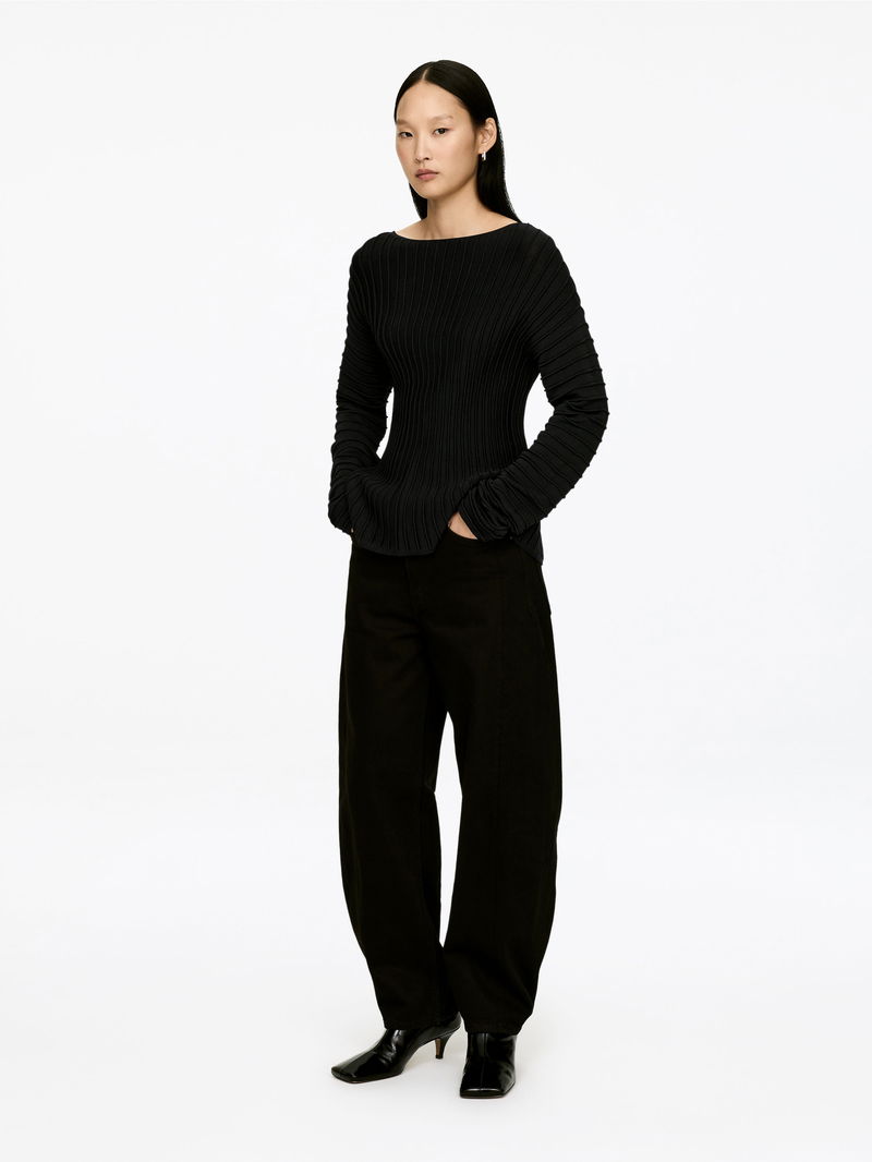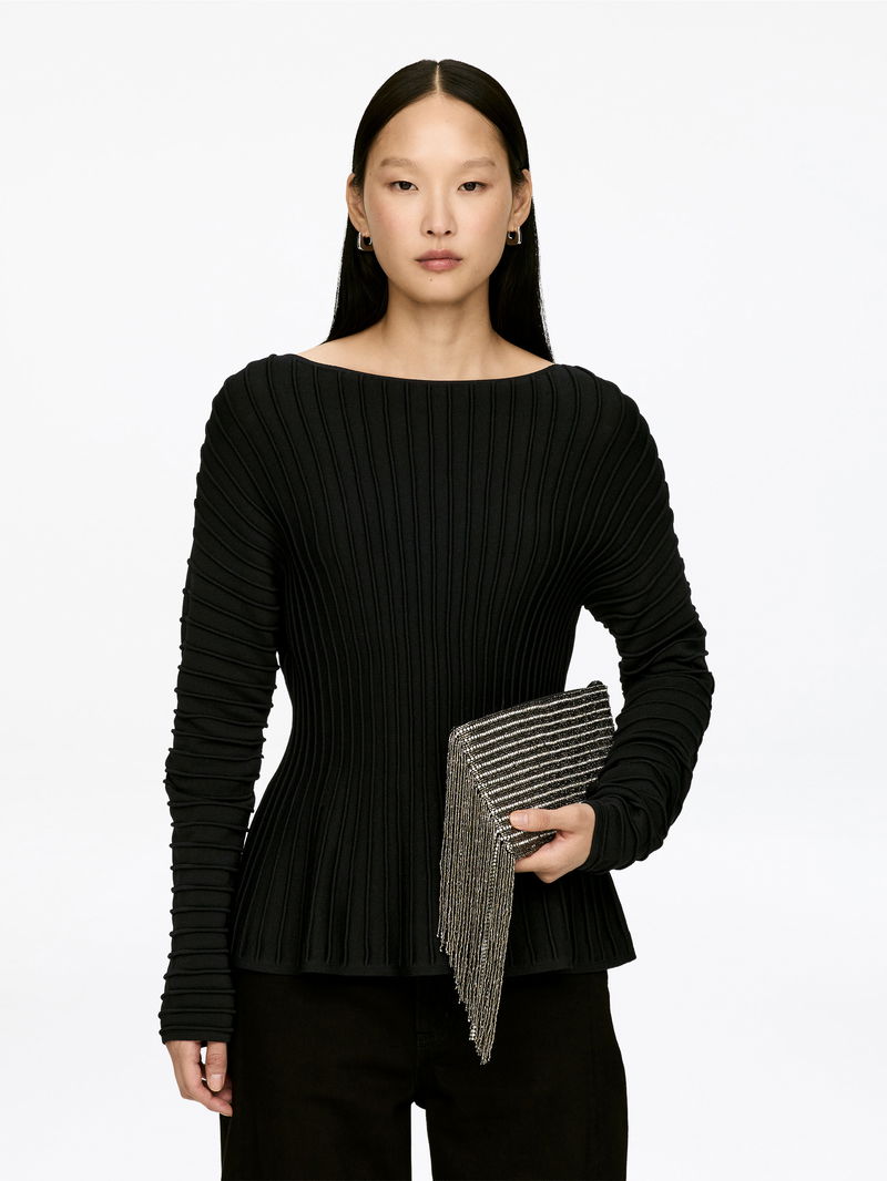 Fine-knit top in a horizontal ottoman stitch, giving the garment a ribbed texture. Features a peplum silhouette.