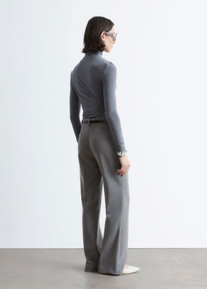 Tailored trousers with press creases at front and back. A cropped style with slanted side pockets and a single welt pocket with button at back. Zip fly with button closure.