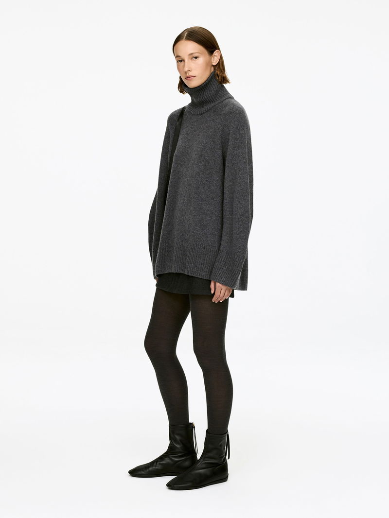 Jumper knitted from pure cashmere. A roll-neck style with a cocoon silhouette and twisted sleeves.