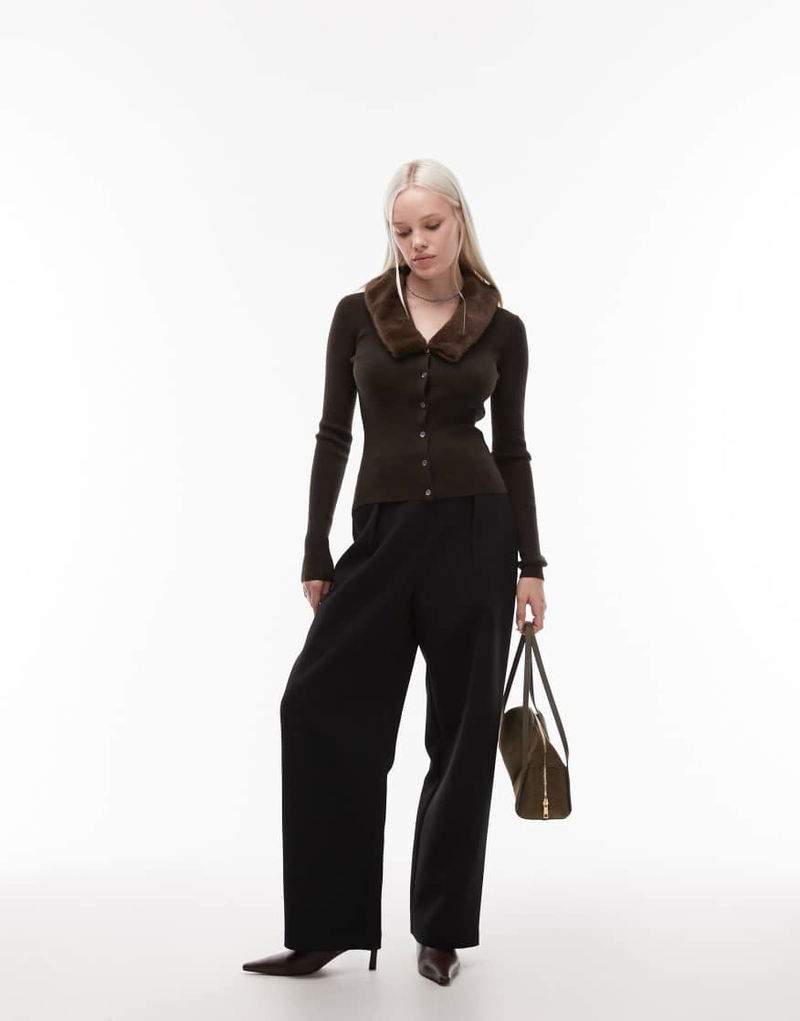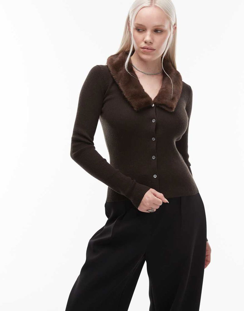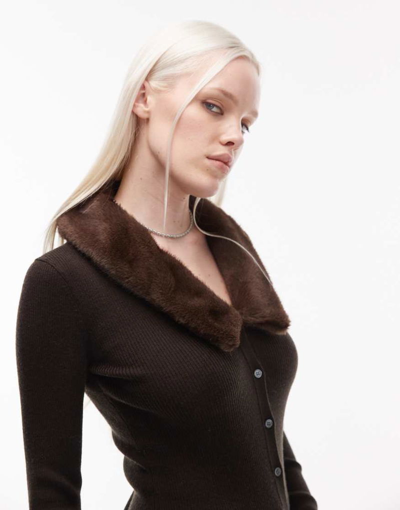 Pure Wool Cardigan With Faux Fur Cuffs And Collar Dark Brown