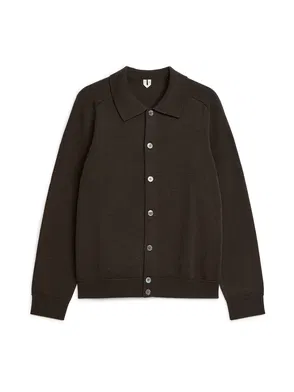 Knitted polo shirt with button closure crafted from a blend of lyocell and recycled wool. This cardigan is detailed with slits at sides and raglan sleeves.