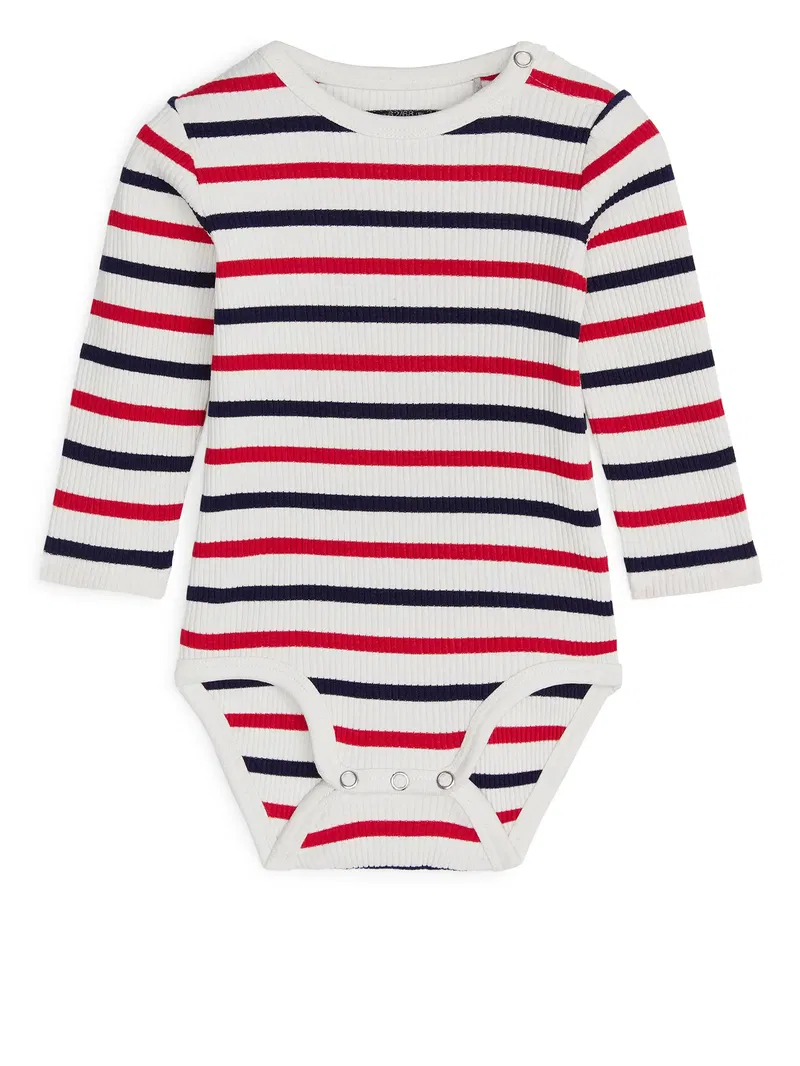 Crafted from a rib-knitted jersey fabric made of organic cotton, this bodysuit is soft to the baby’s sensitive skin. A long-sleeve style with snap button at left-hand shoulder and at crotch for easy dressing.