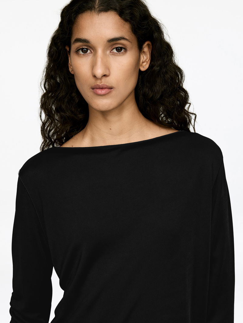 Boat-neck top crafted from lustrous satin-quality viscose, featuring extra-long sleeves and babylock hems.
