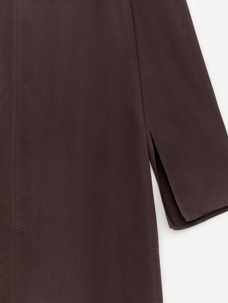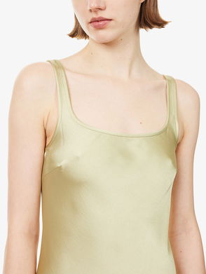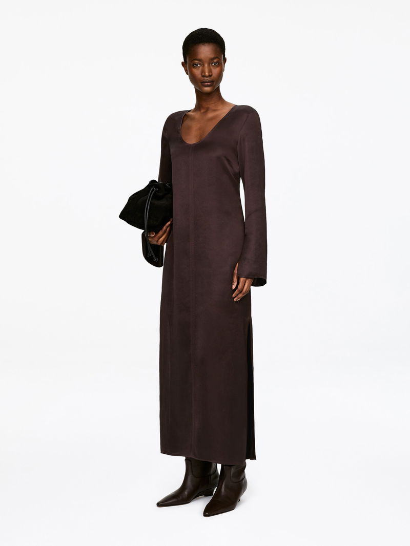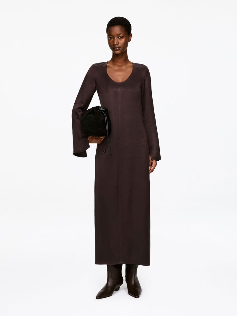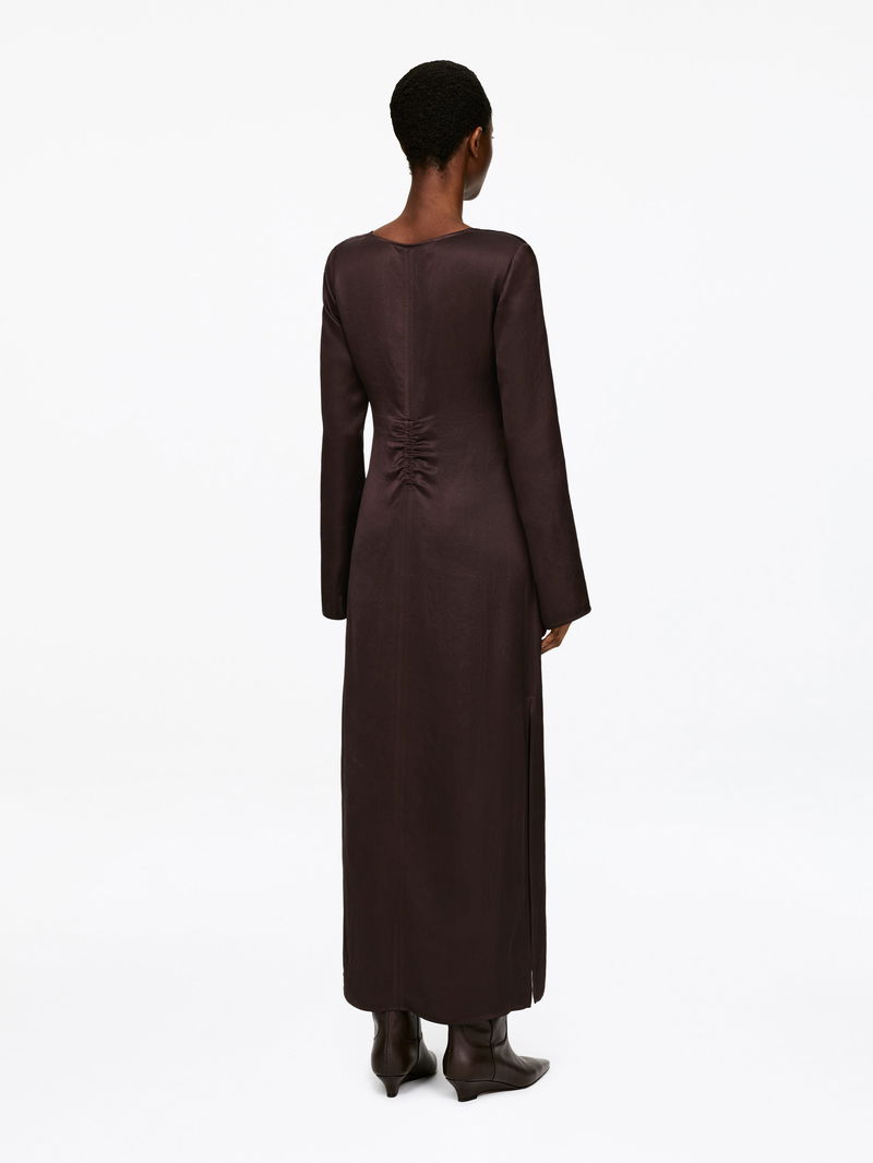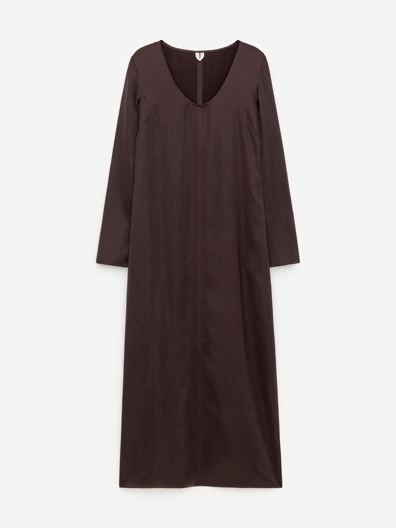 A full-length satin dress with a soft sheen, defined by an understated scoop neckline and long sleeves split at the cuffs.