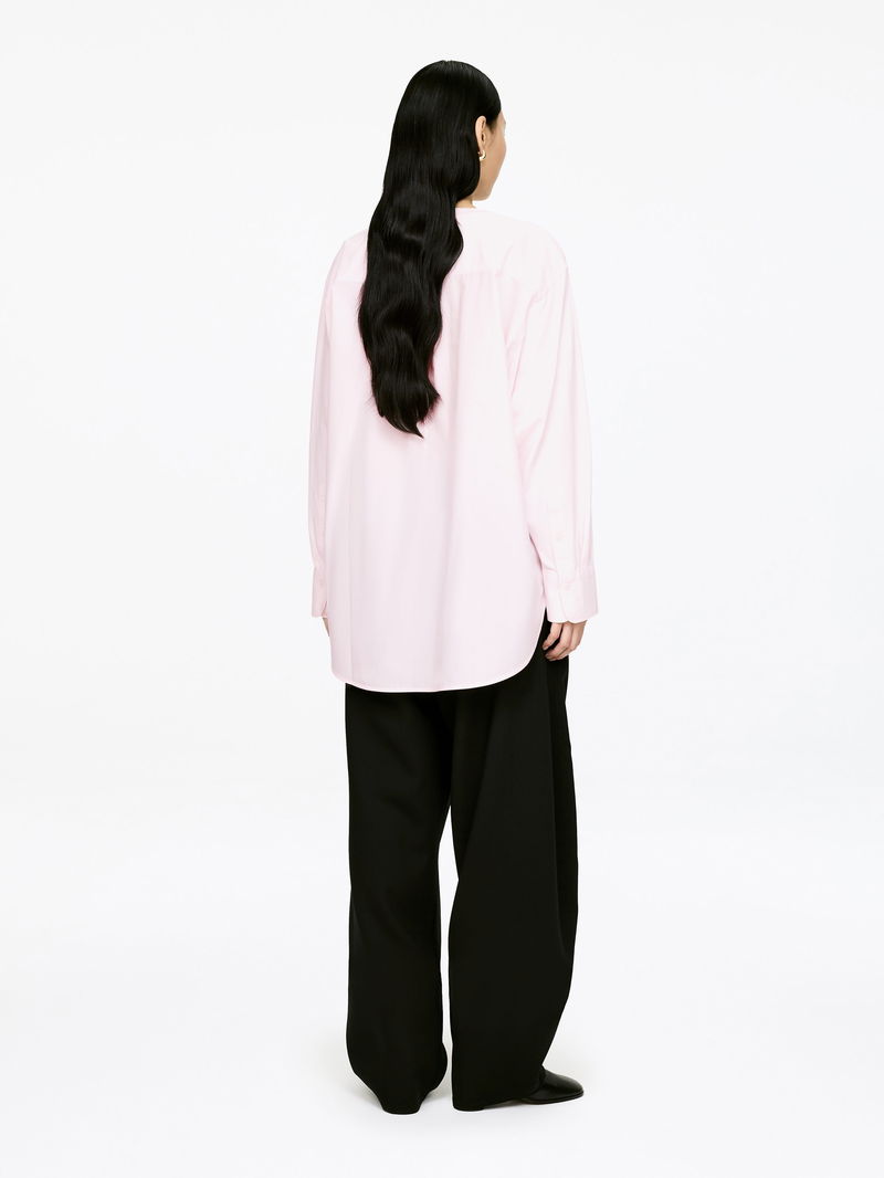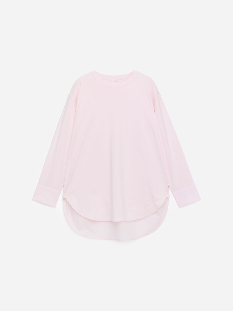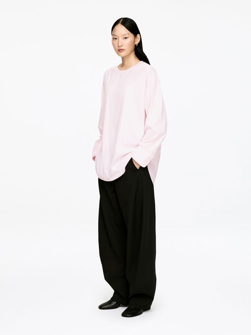 Long-sleeve cotton jersey T-shirt with woven fabric on the sleeves, cuffs, and back. Detailed with buttoned shirt cuffs and a pleat at the back of the neck to add volume to the silhouette.