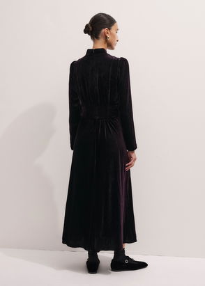 Full-length dress crafted from a silk blend. A long-sleeved style featuring a V-neck and a tie-band at waist.