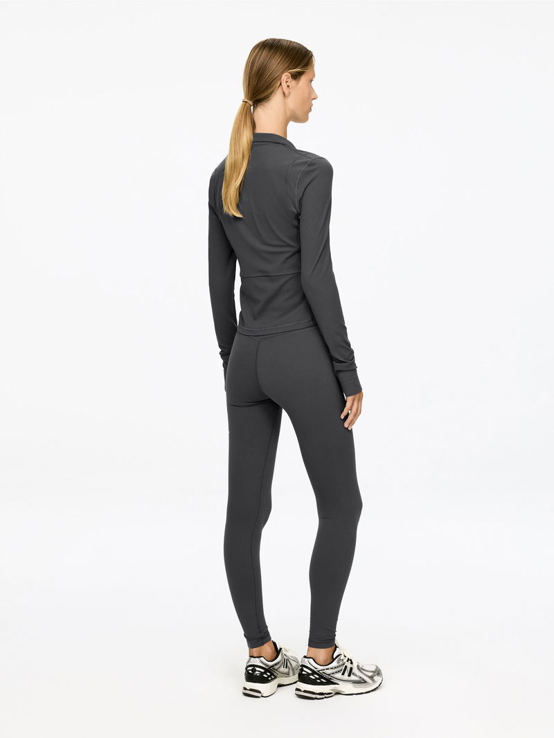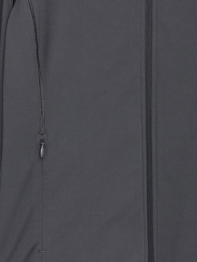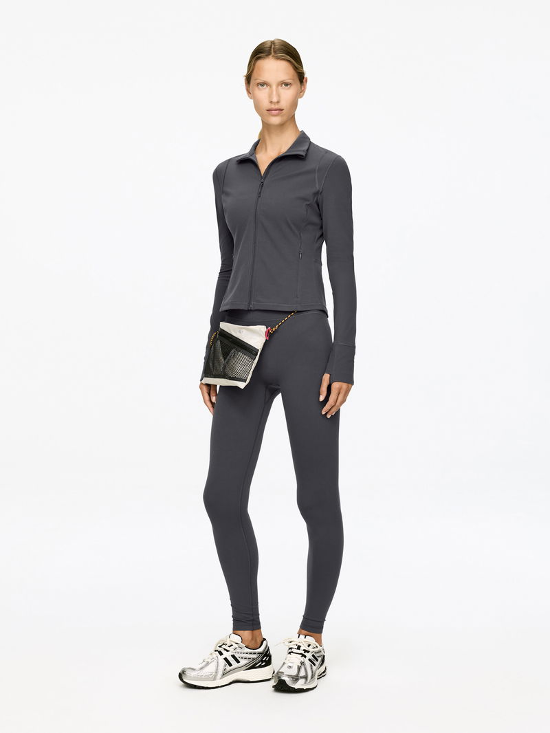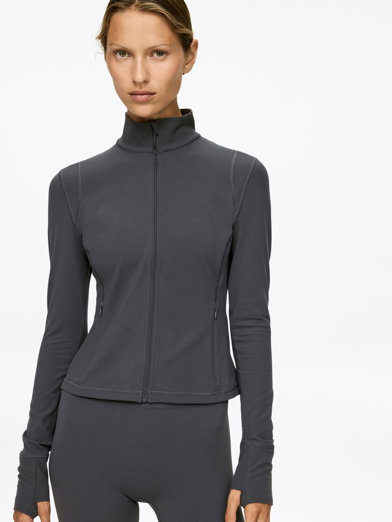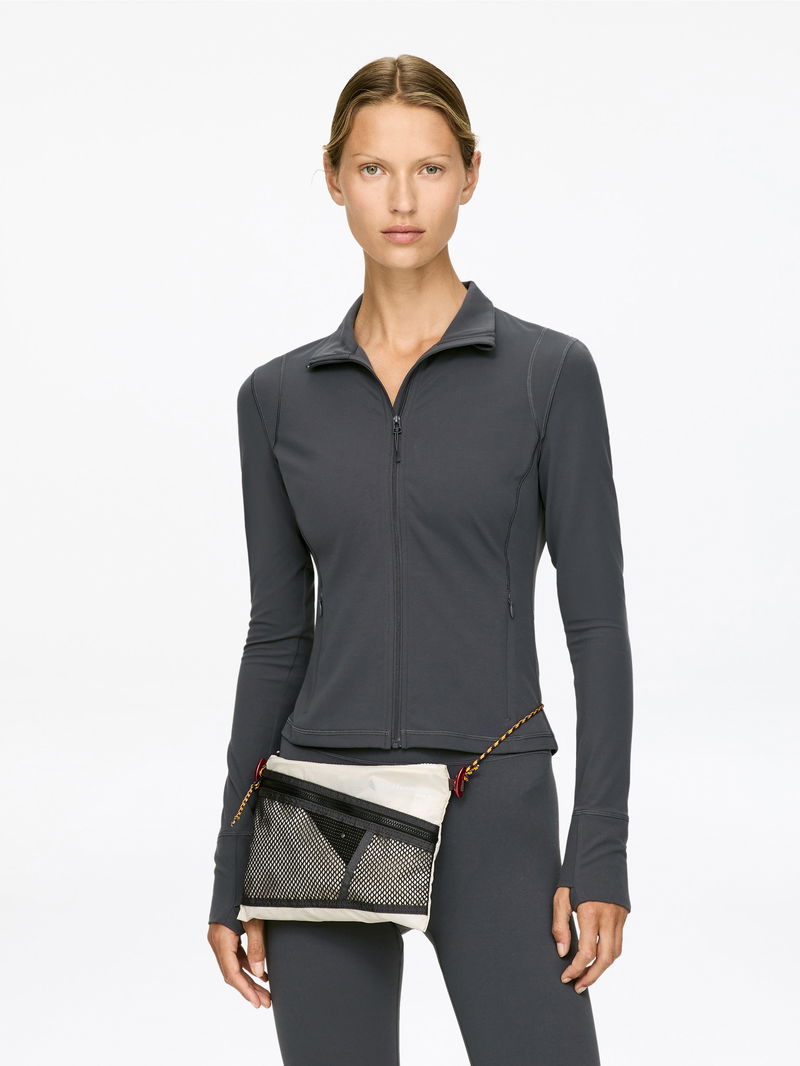 Long-sleeved zip-up jacket featuring a double-layered stand collar and thumbhole cuffs. Includes zip pockets for secure storage. Slim fit.