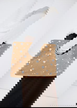 Suede bag with a cotton lining, inspired by a classic bowling bag. A half-moon-shaped style with top handles and a long, adjustable shoulder strap. Decorative stitching at the bottom sides, zip closure, and an internal patch pocket.