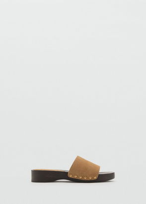 Flat thong sandals with a suede upper. Adjustable strap with gold-toned buckle closure.