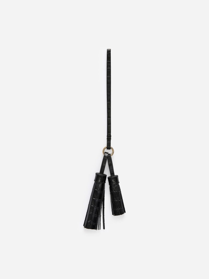Tassel bag charm crafted from leather that has undergone a chrome-free tanning process. Features a ring hook and tassels in varying sizes. Strap length 20 cm.