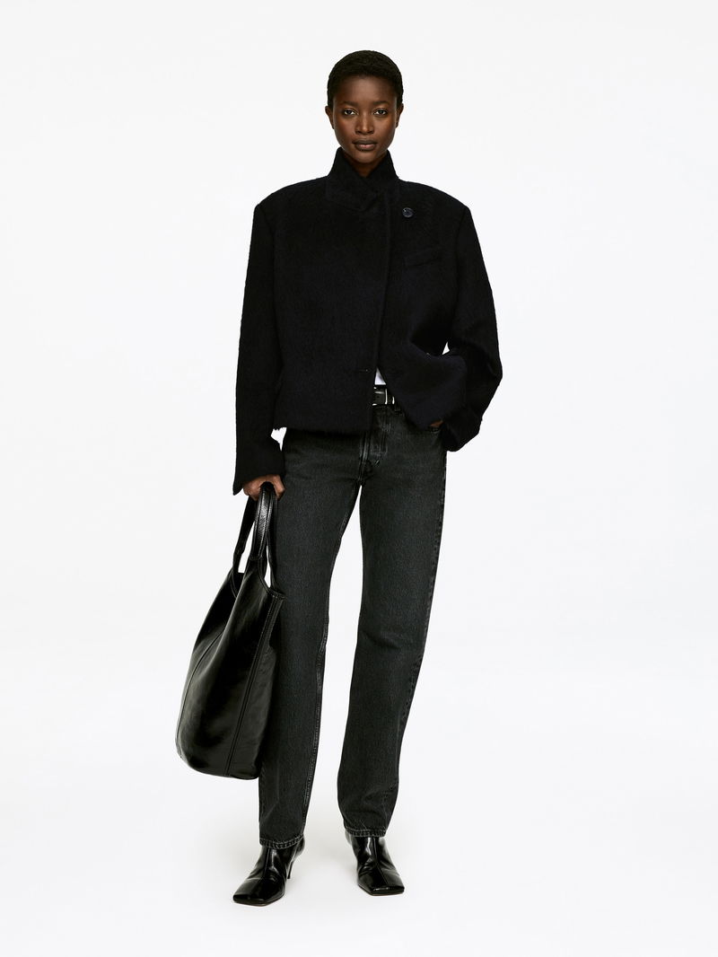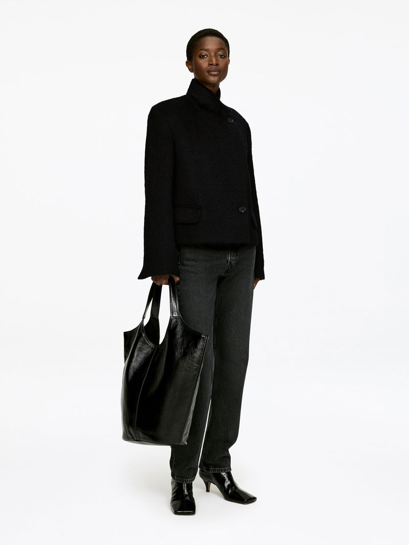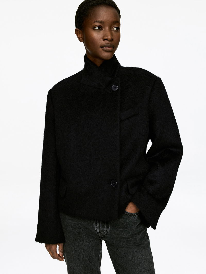 Oversized jacket with the feel of a fully lined blazer, crafted from a wool–alpaca blend. Designed with a stand-up collar, two visible buttons, a welt chest pocket, double welt pockets, and a vent at the sleeve hem.