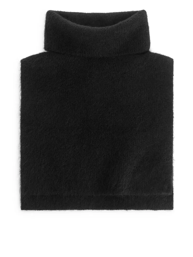 Collar with a hairy texture knitted in a half cardigan stitch using a blend of alpaca and wool.