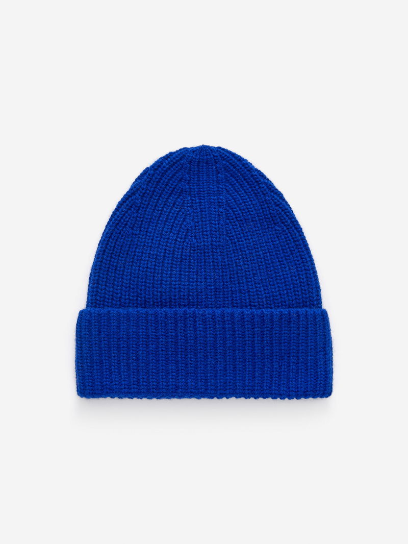 Rib-knitted beanie crafted from pure wool. Chunky style with a fold-up.