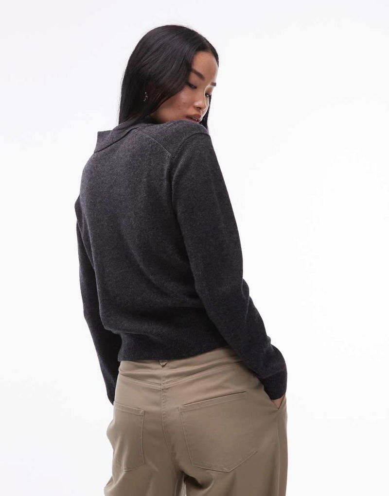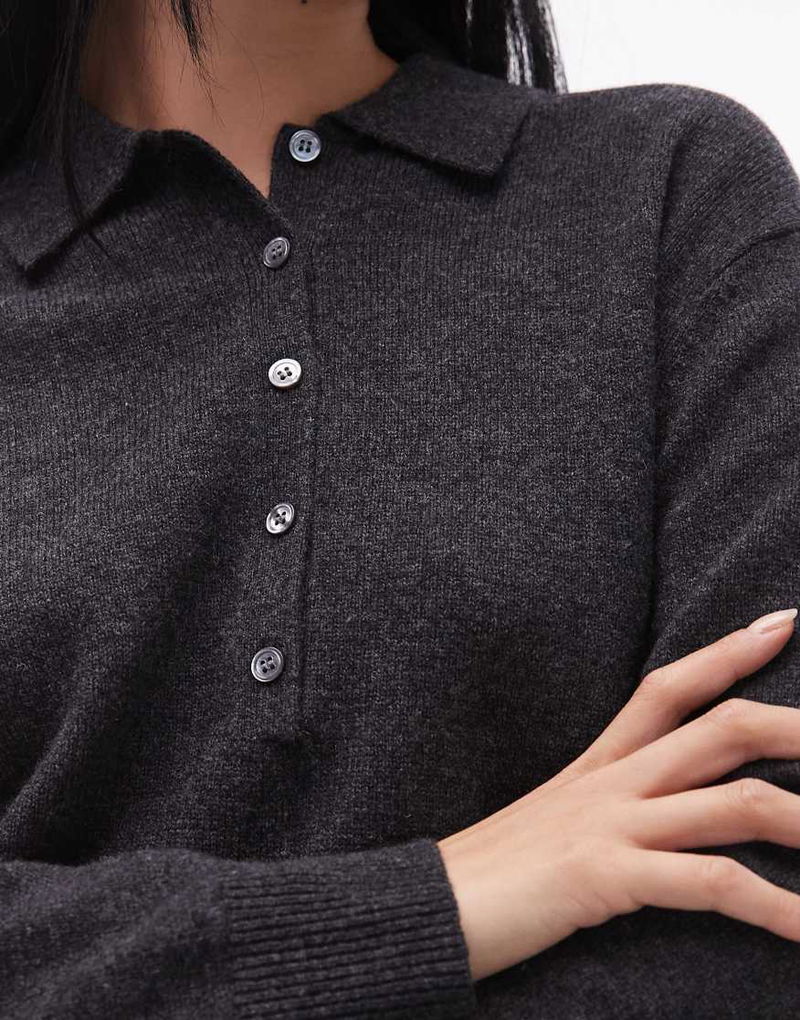 Wool Knitted Sweater With Deep Placket Polo Collar In Dark Grey Melange