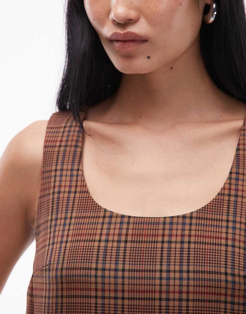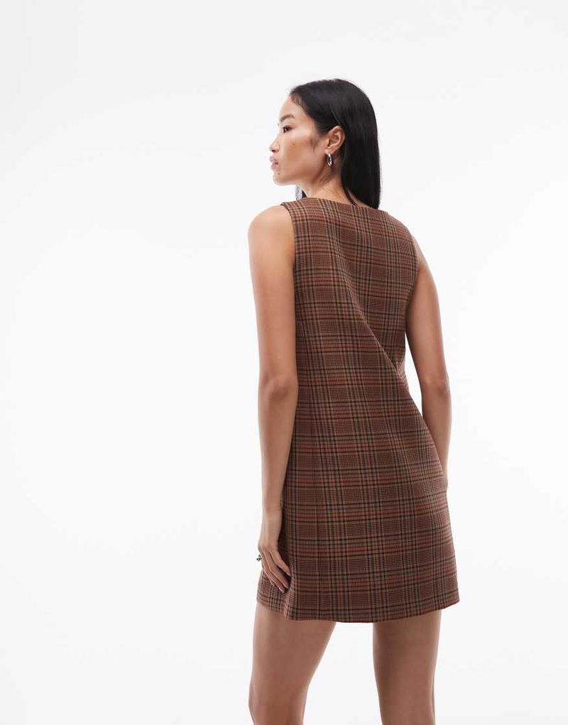 Wool Sleeveless Mini Shift Dress In Brown Check