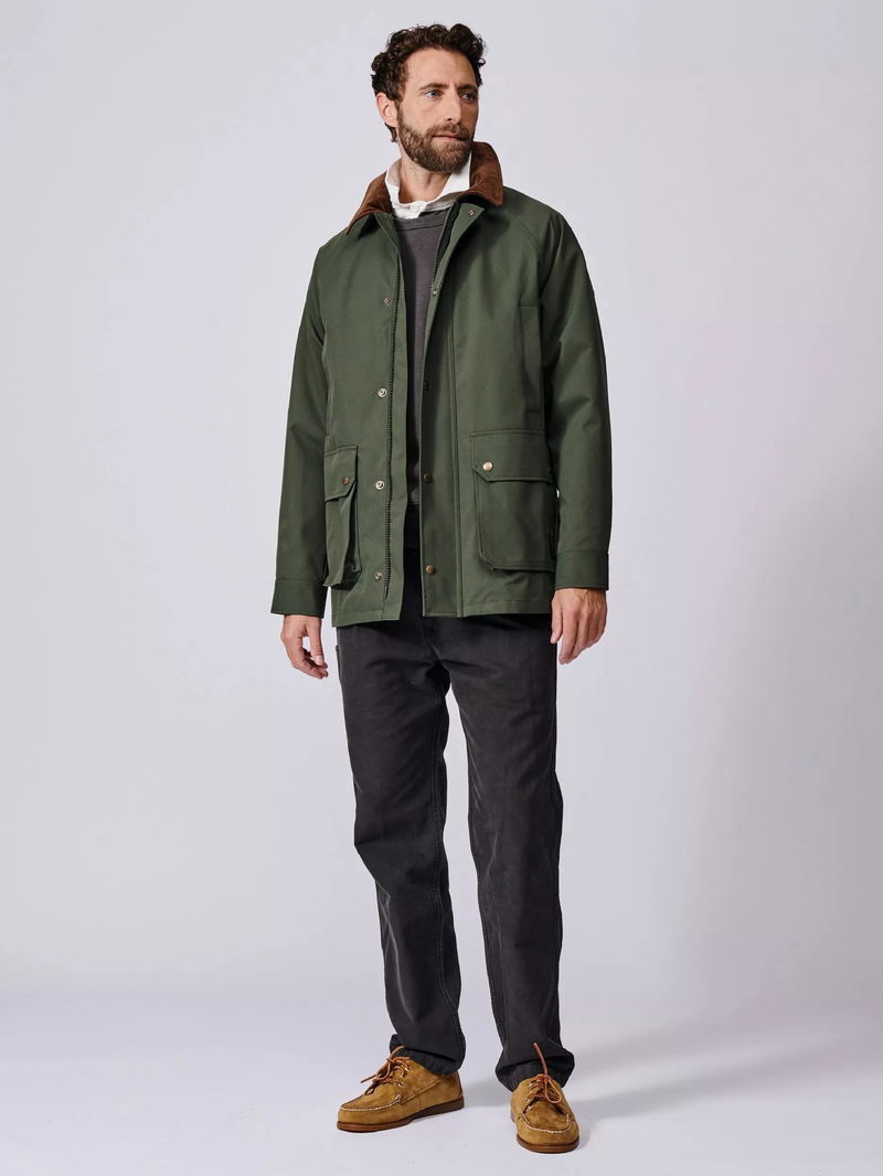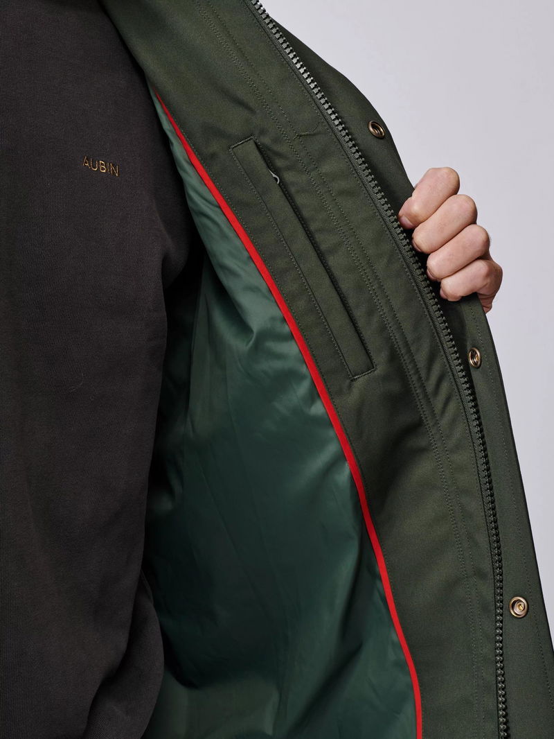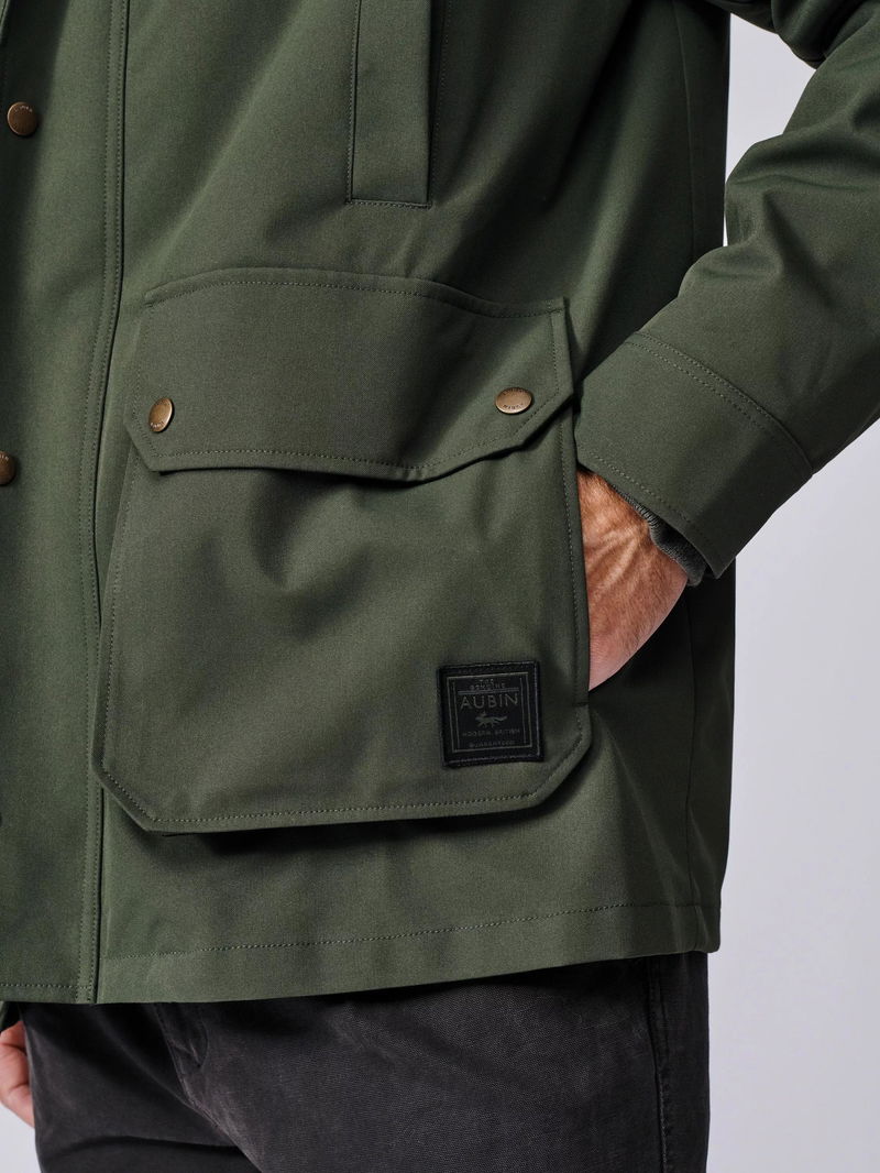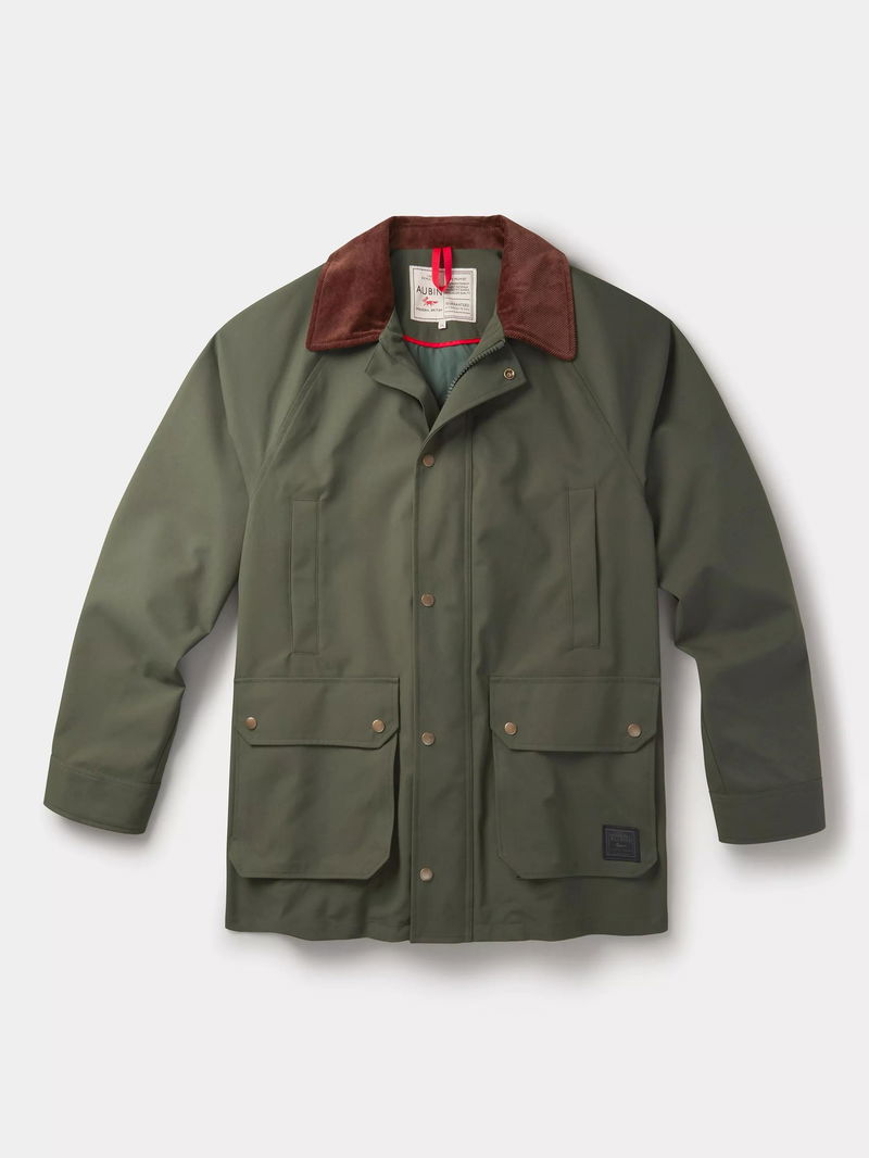 It's finished with a corduroy top collar featuring a throat latch detail, and an Aubin-branded patch on the bottom pocket.