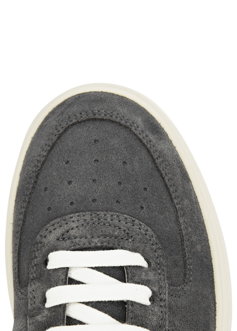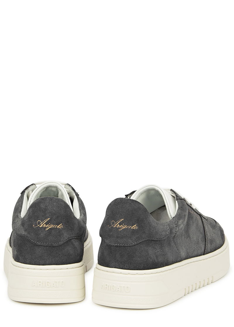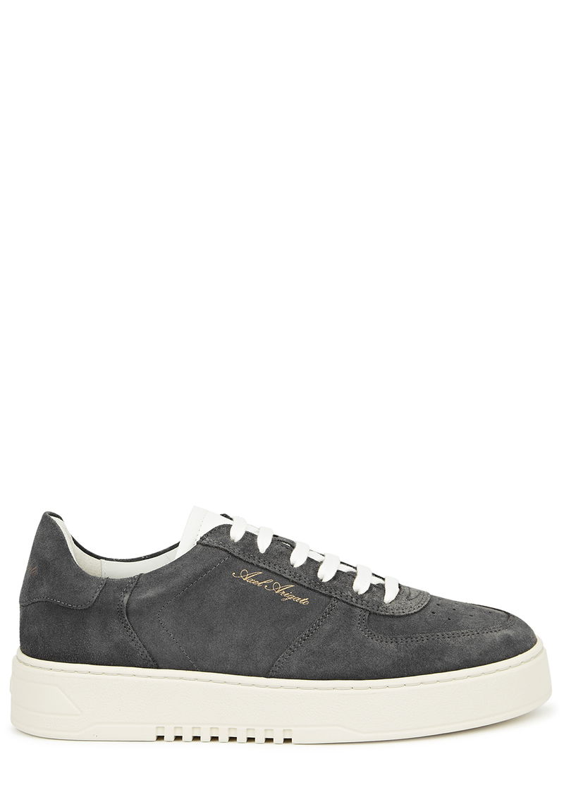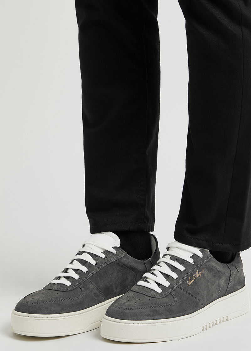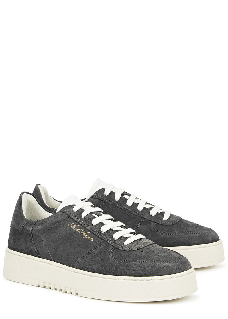 Axel Arigato suede sneakers. Designer stamp at side and heel, perforated details at toe, designer-embossed stamp at back midsole, serrated inserts at white rubber sole, round toe. Lace-up front.