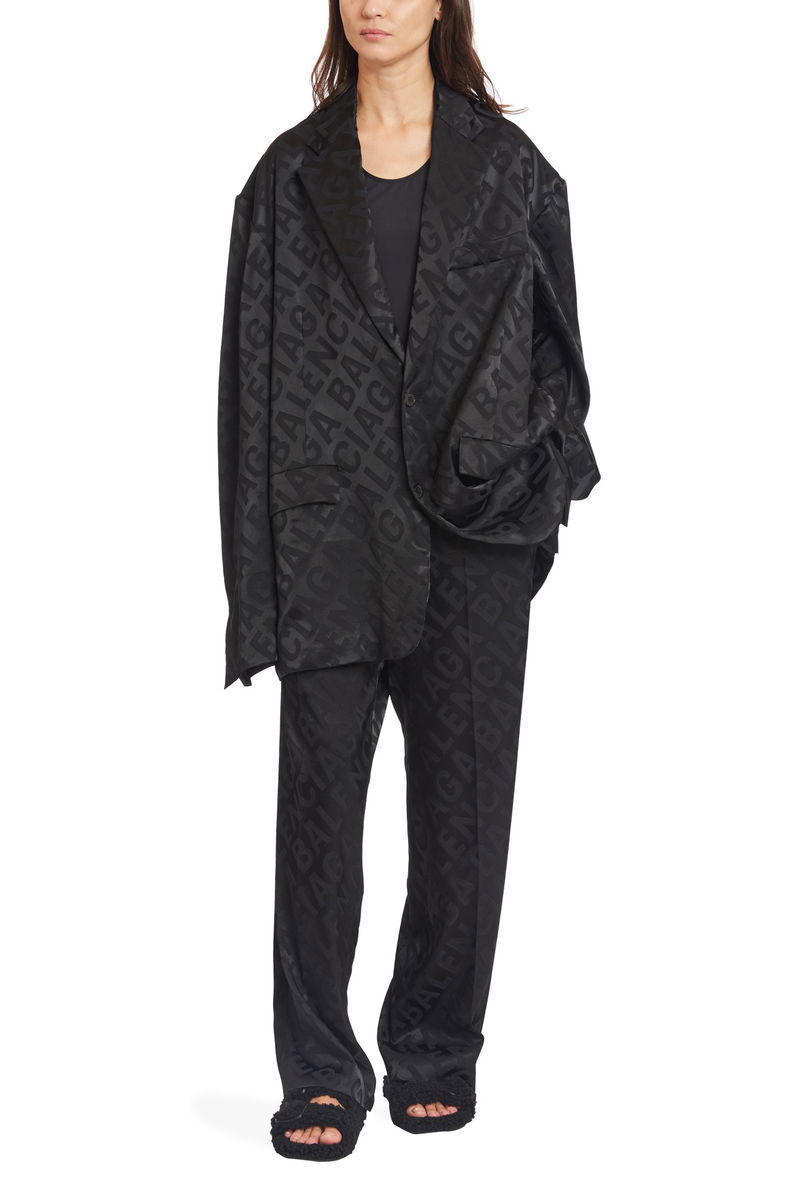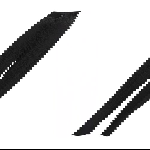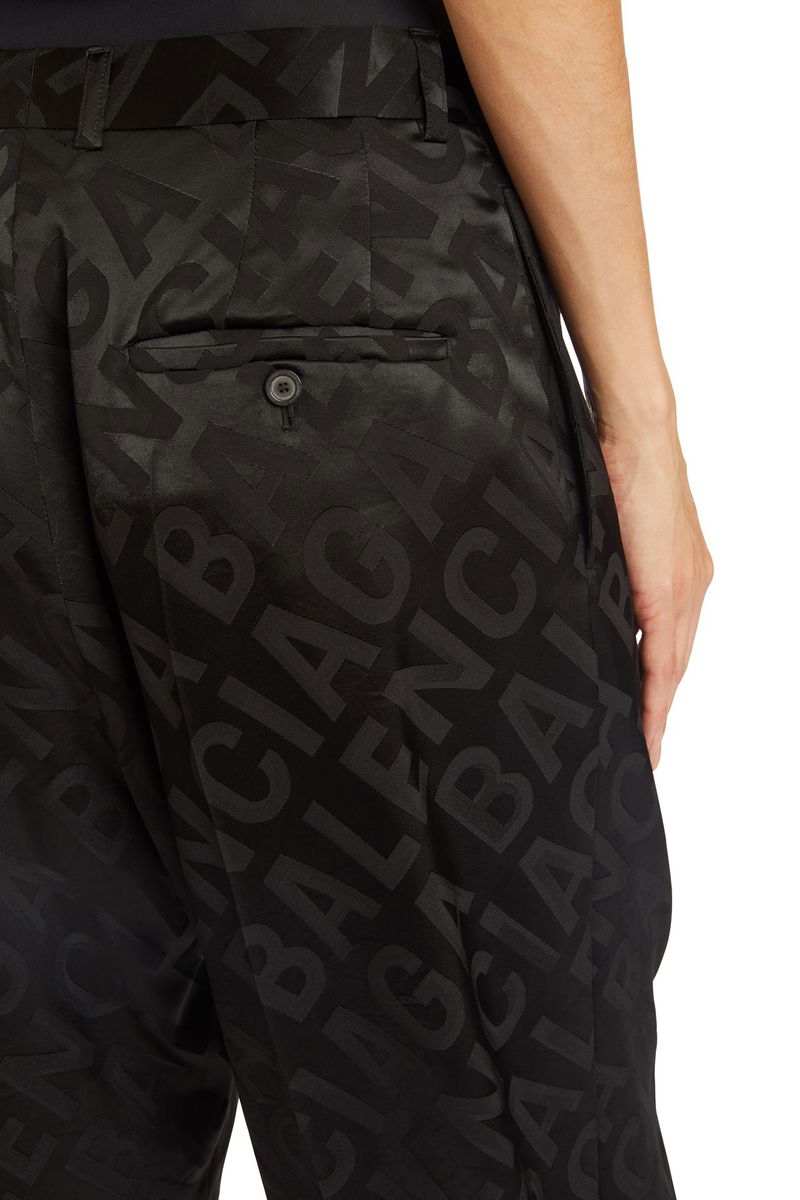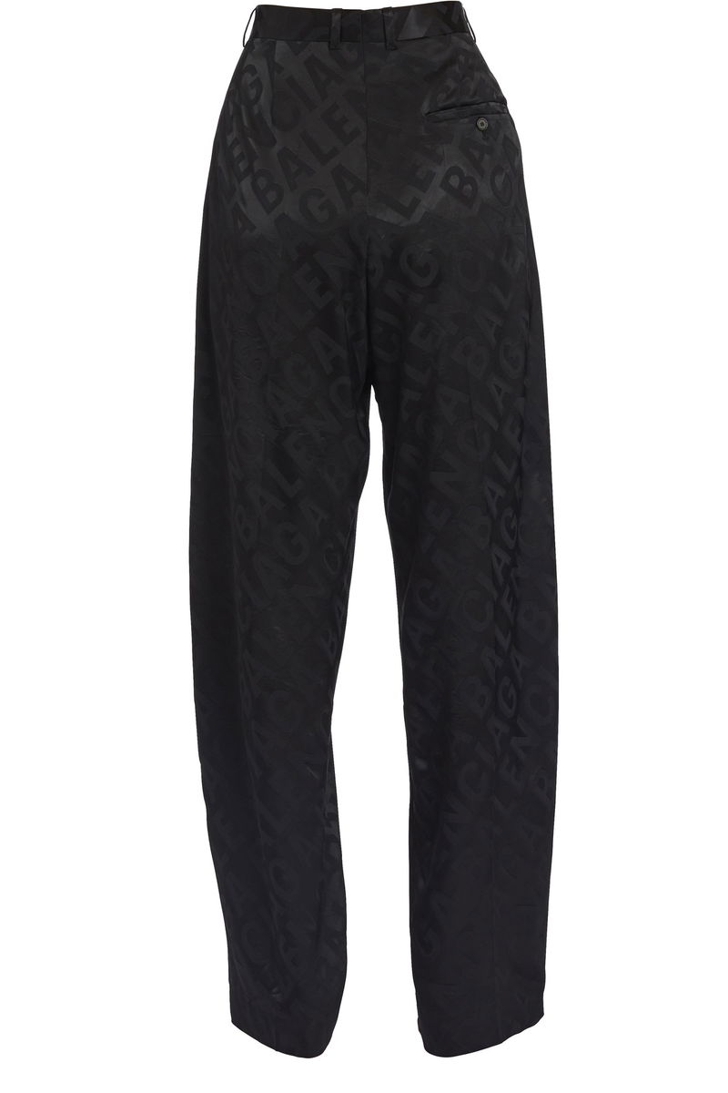 Wide-leg pants. Flowing fit. Front button. Belt loops. All-over Balenciaga logo. Piped back pocket. High-waisted fit.