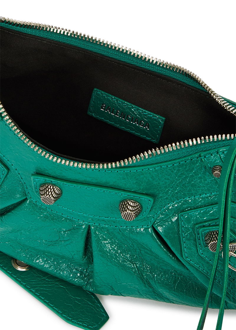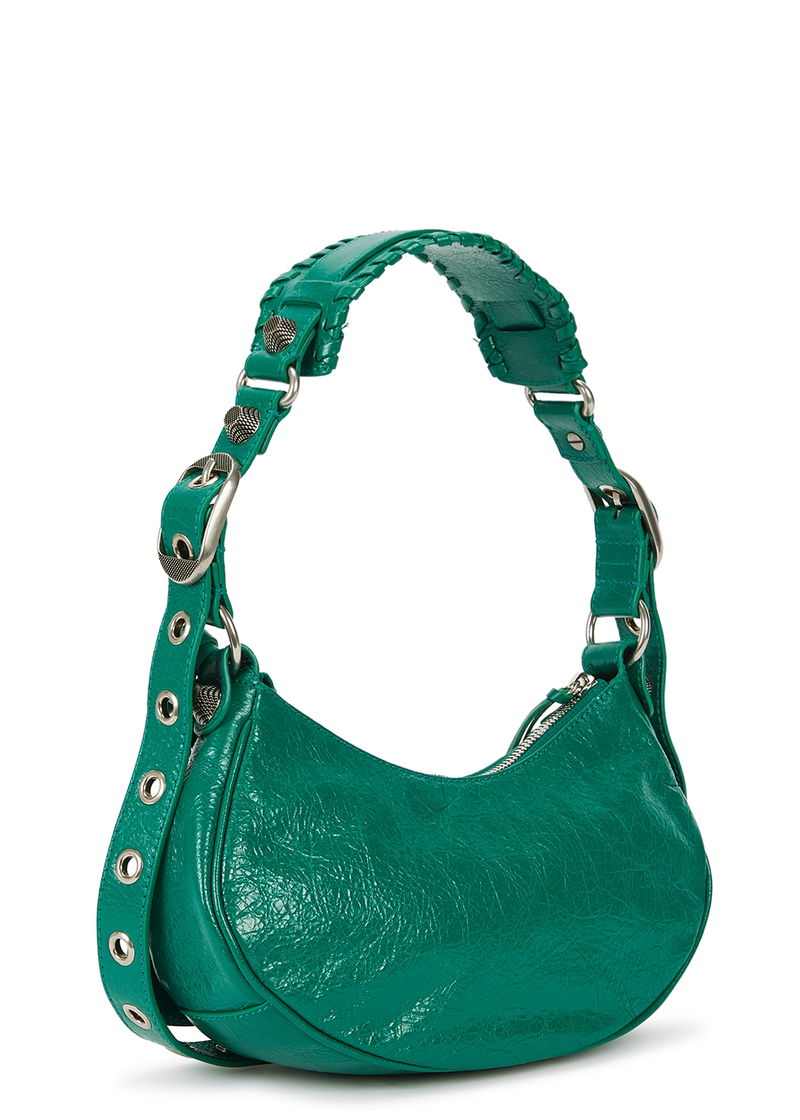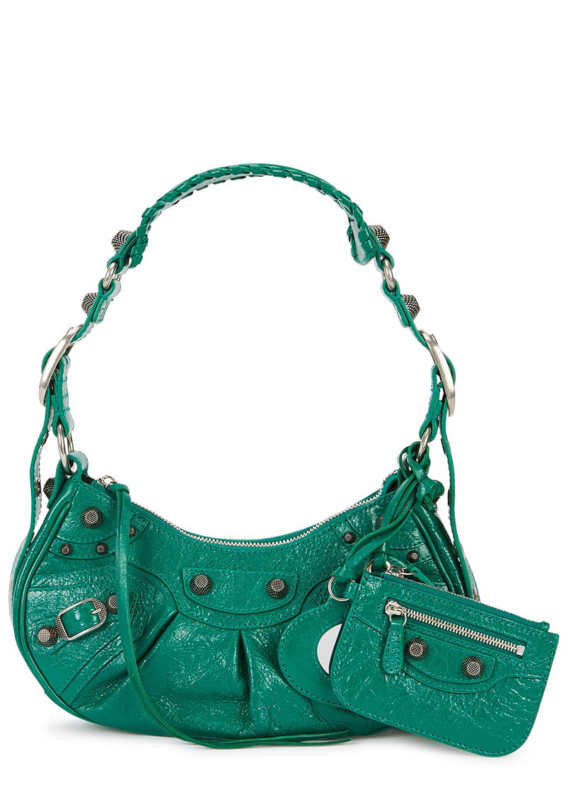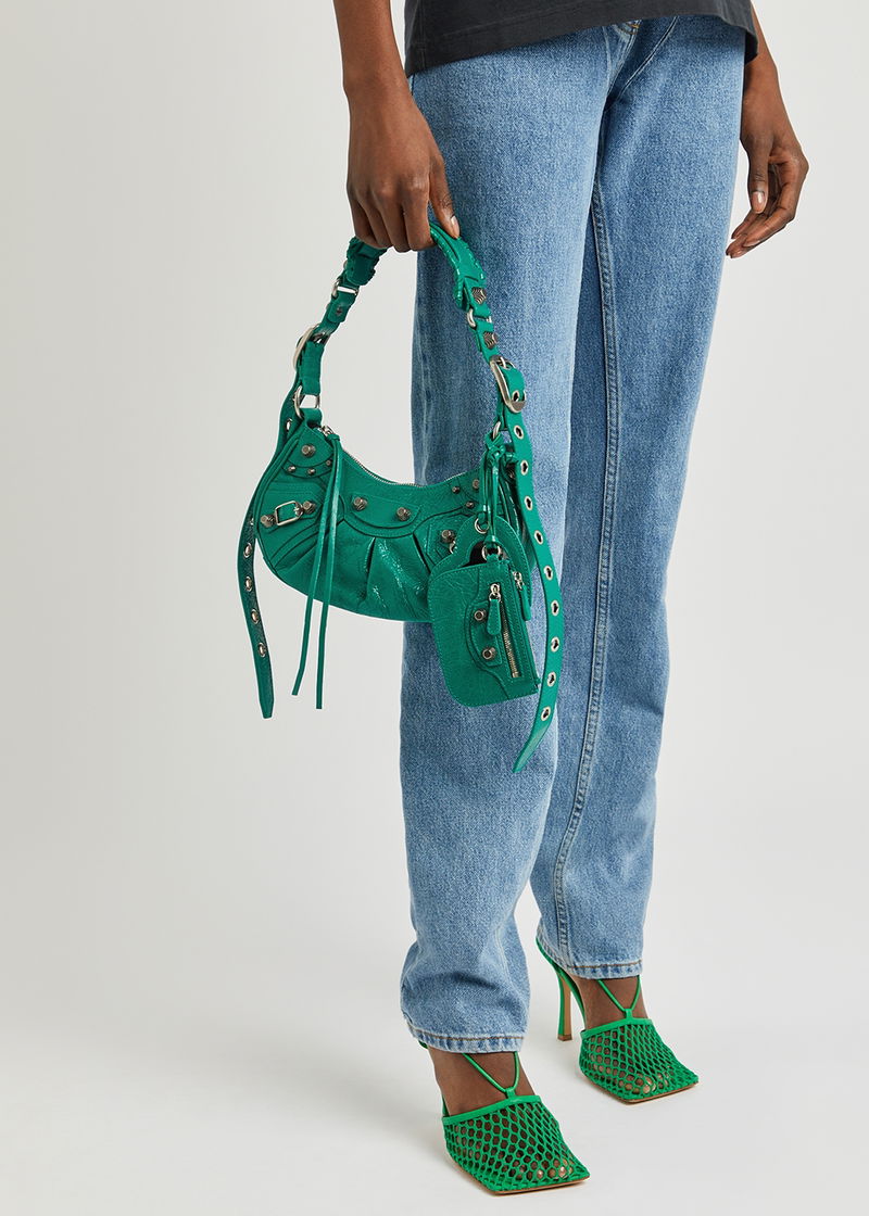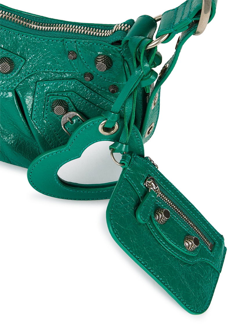 The Le Cagole reinterprets elements of Balenciaga’s signature City bag into a 2000s-inpsired shoulder design. Crafted from glossed leather, this green XS version is studded with silver-tone hardware and finished with a matching hanging pouch and heart-shaped mirror.