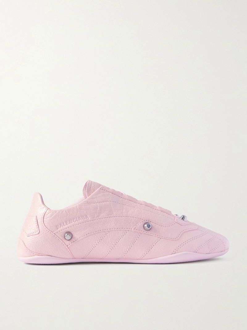 They have a slim profile, modeled on retro runners, and are made from crinkled-leather with debossed logos.