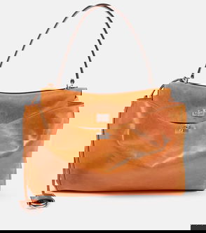 Balenciaga’s taupe-beige Cloud bag is named after the voluminous shape achieved by creating folds in the patent crocodile-effect leather. Crafted in Italy, it has an internal top frame with an antiqued gold BB-engraved clasp and a white logo print on one side. Carry it as a clutch or adjust the slender strap for a cross-body look.