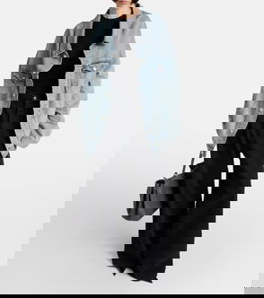 Cropped jacket. Straight cut. Adjustable waist. Classic collar. Flap pockets. Side welt pockets. Faded effect. Buttoned fastening.