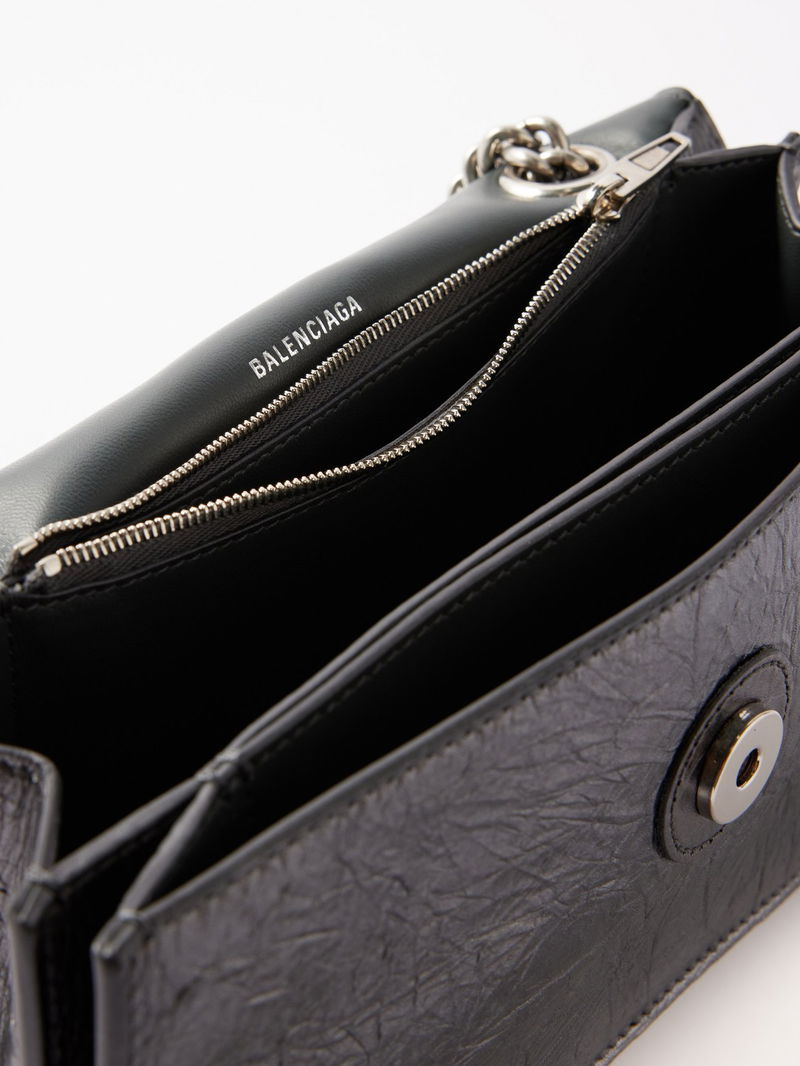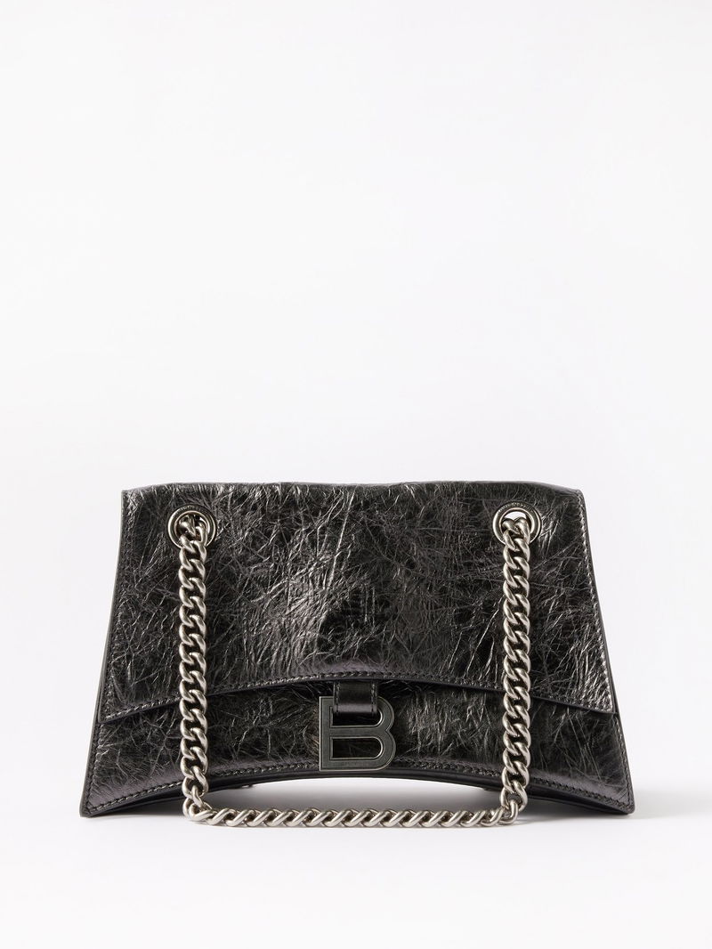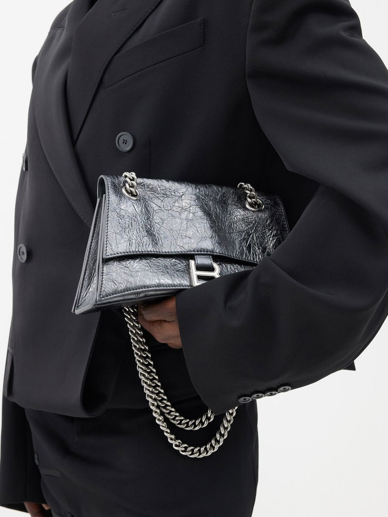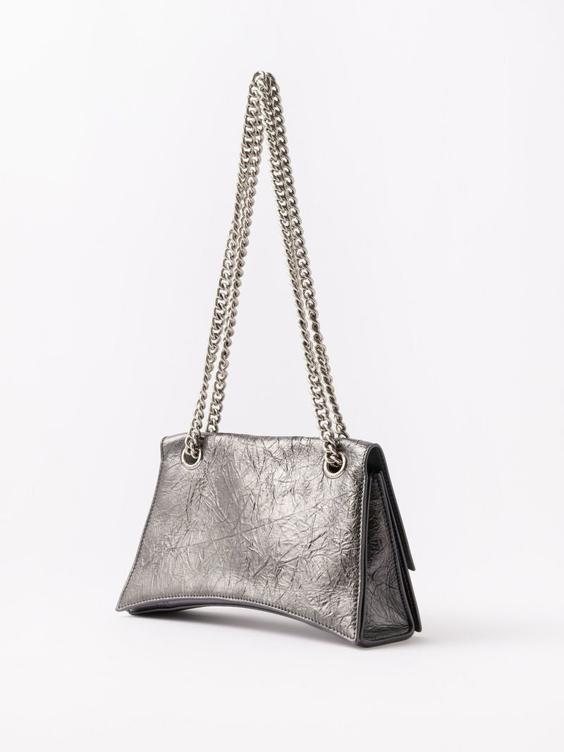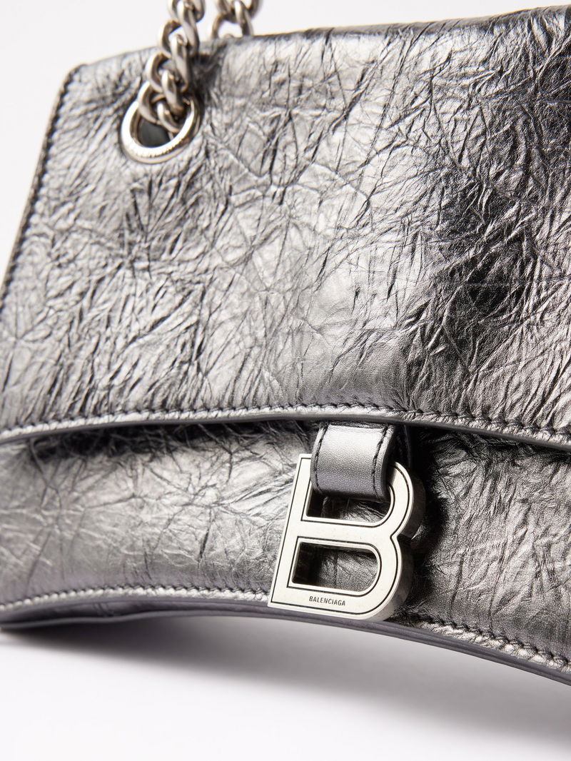 A metallic lustre is applied to this iteration of Balenciaga's signature Crush bag, rendered in dark-grey creased leather with antiqued silver hardware.