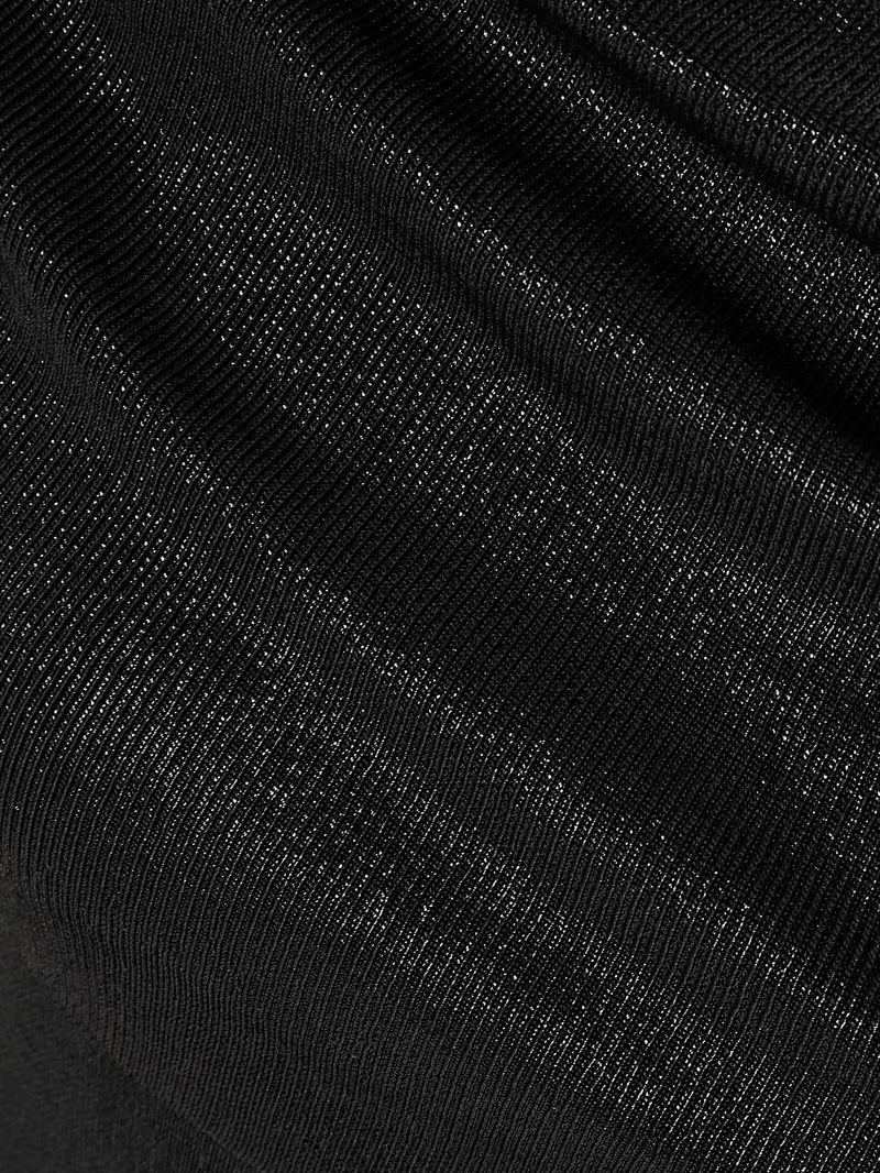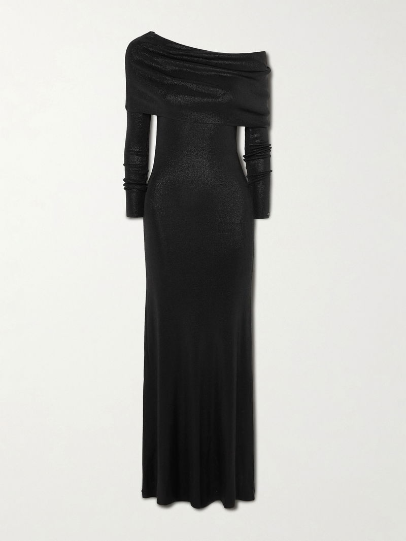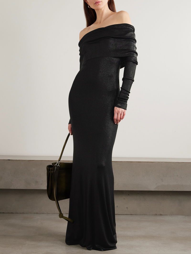 Balenciaga's off-the-shoulder dress is minimal, save for the draped bodice. It's knitted from metallic yarn that has a slinky, foiled effect.