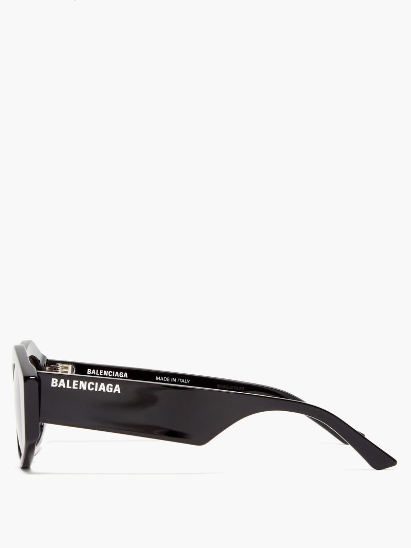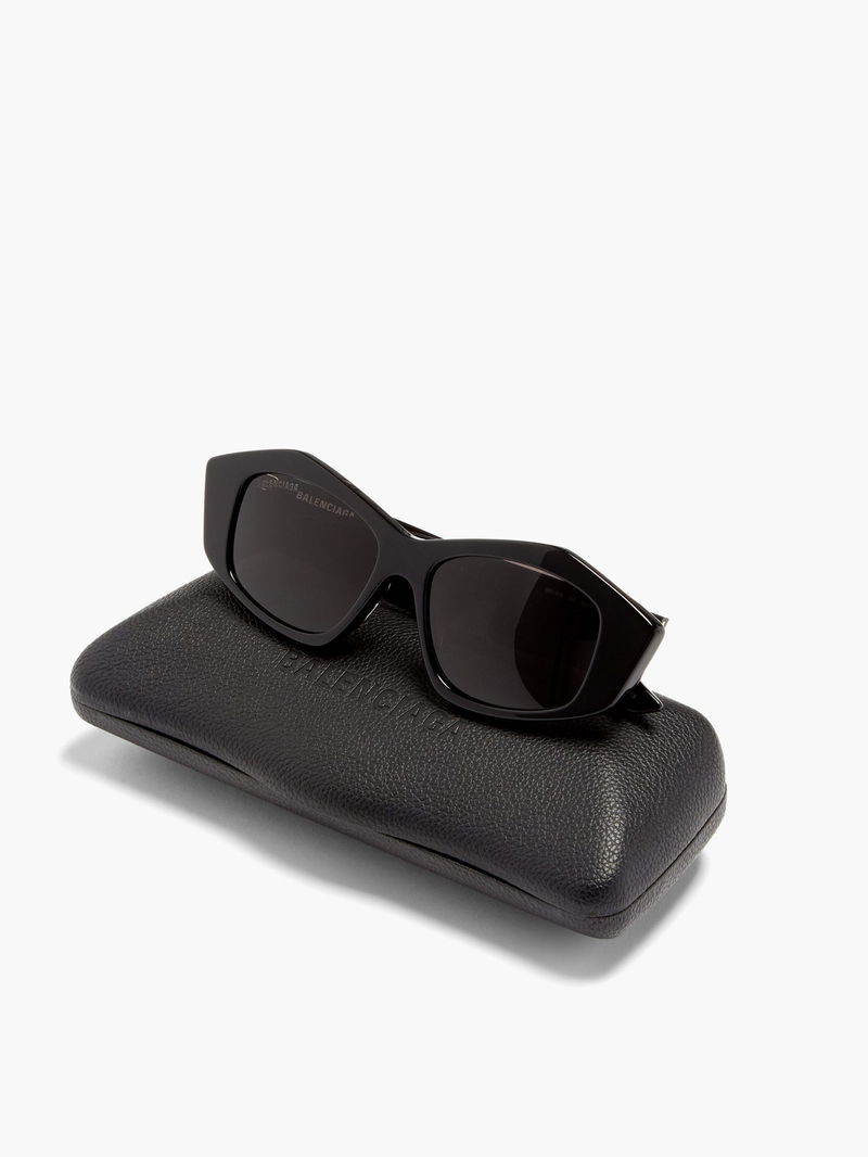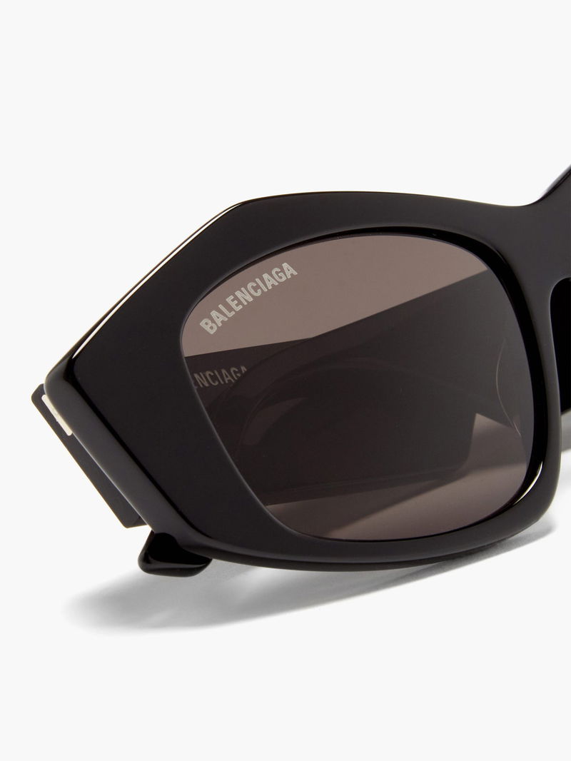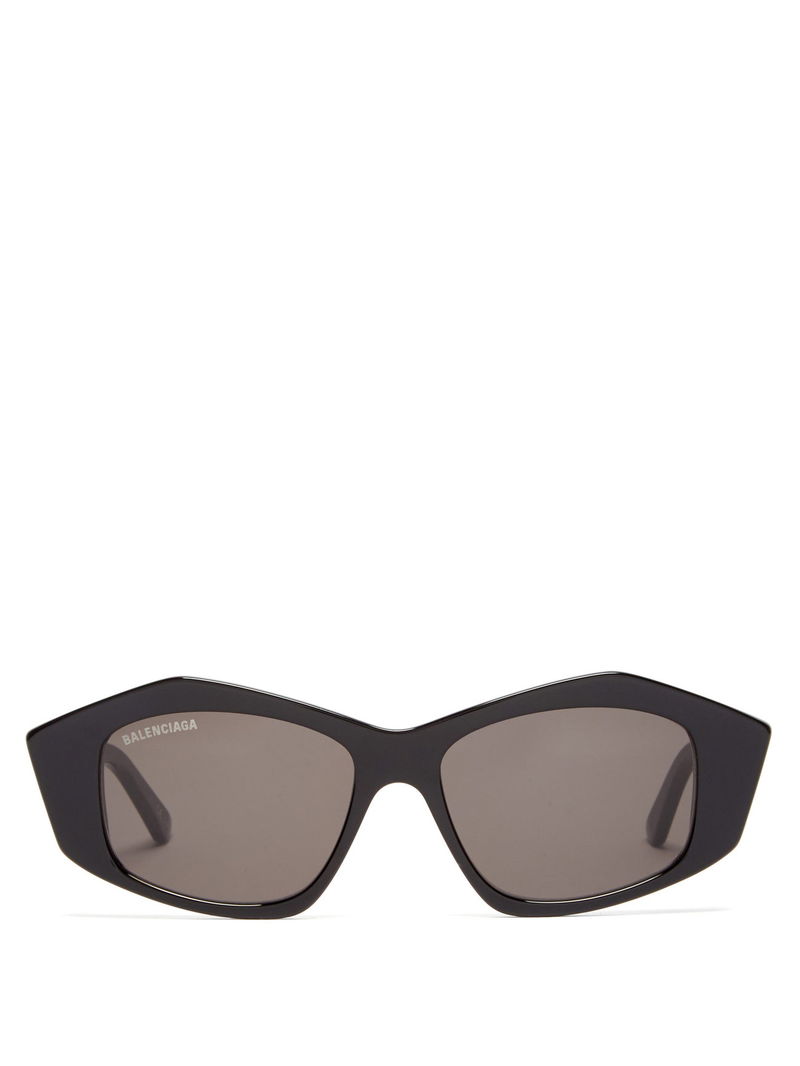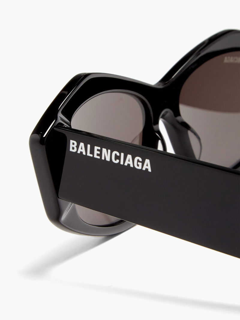 The distinctively geometric, pentagonal shape of Balenciaga’s black sunglasses makes them a standout eyewear choice. Made in Italy, the smooth acetate frames encase dark grey-tinted lenses with 100% UV protection and the wide arms are engraved with white logos at the temples.