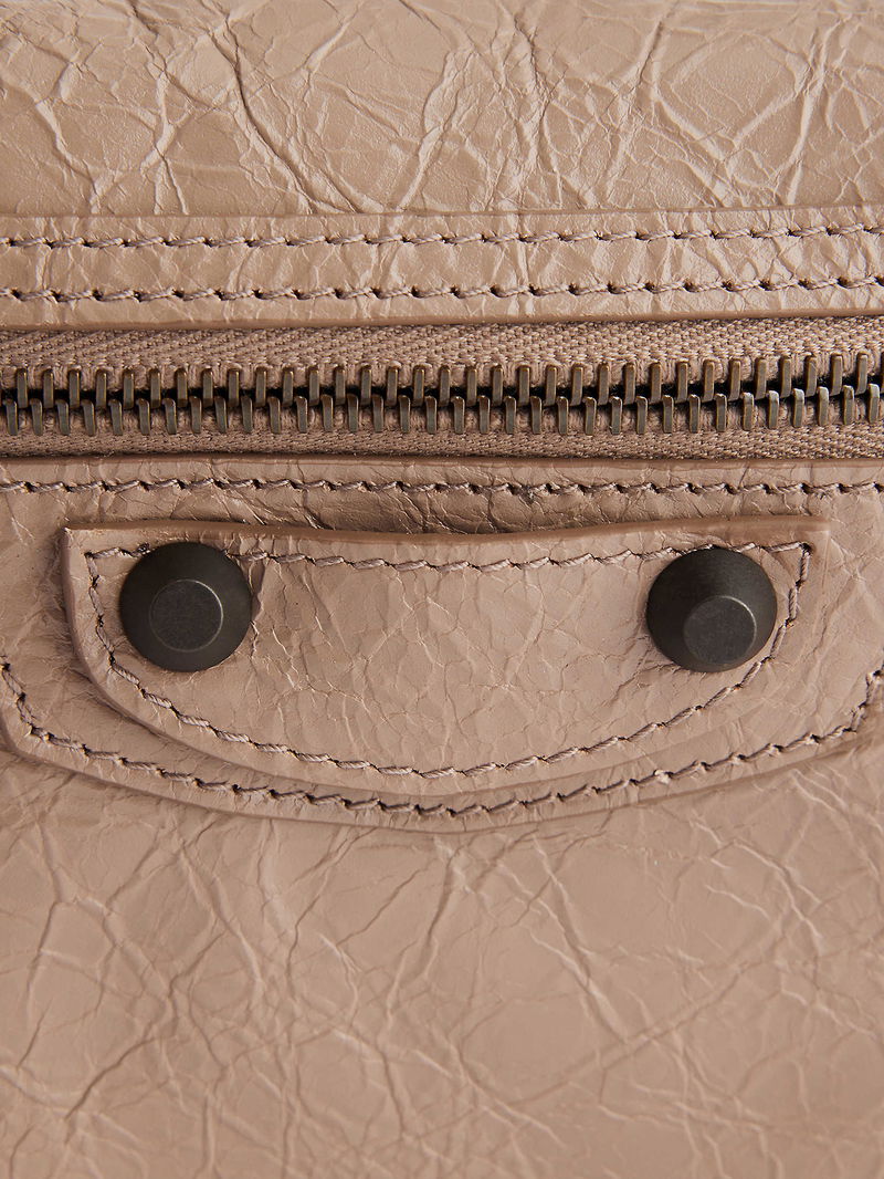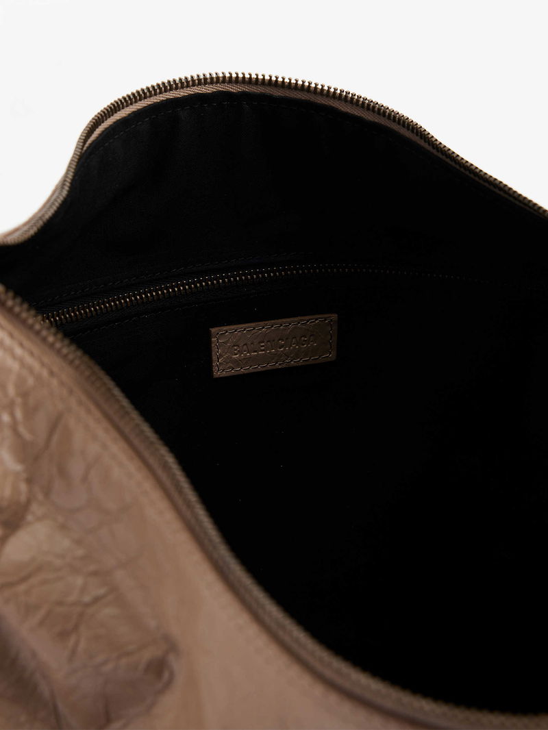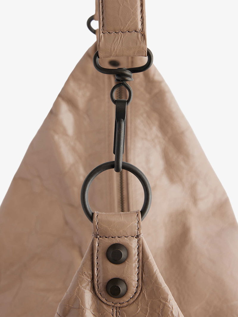 Balenciaga leather hobo bag. Detachable top handle, detachable adjustable shoulder strap, zip pocket at front, buckles and studs at front, all-over crinkled leather, one main compartment, internal zip pocket and brand patch, fully lined- 100% lamb leather; lining 100% cotton