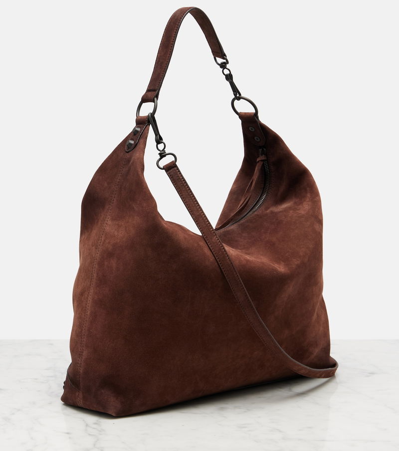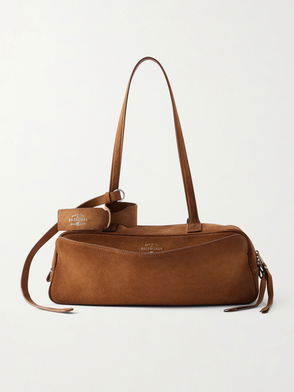Balenciaga revisits an iconic silhouette with the Le City shoulder bag. Crafted from soft suede, this spacious design features signature studded detailing, a detachable strap, and various zipped pockets.
