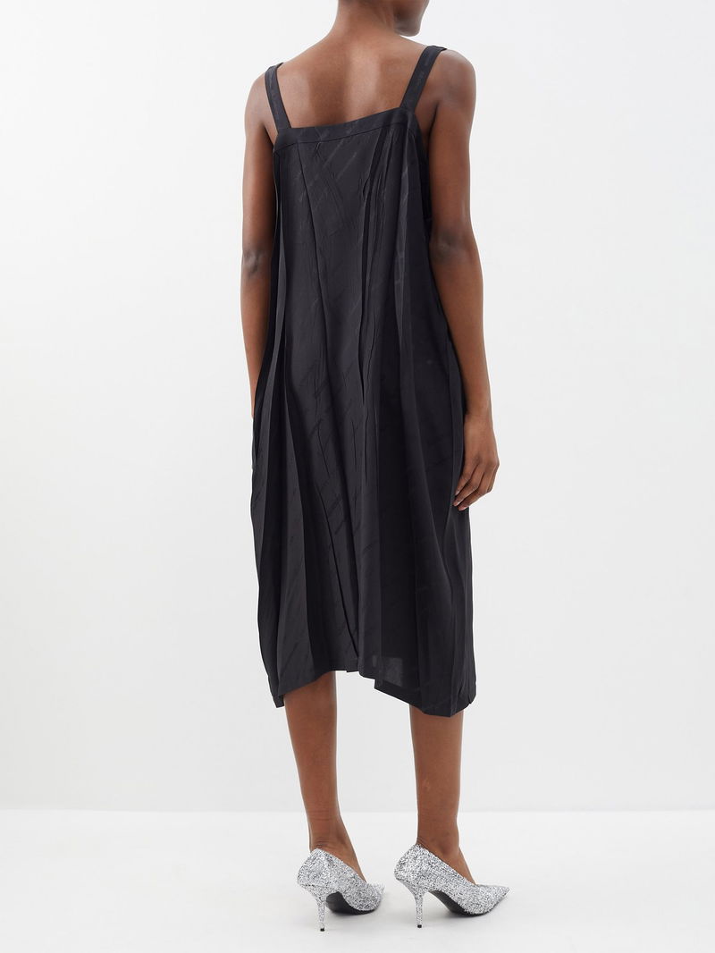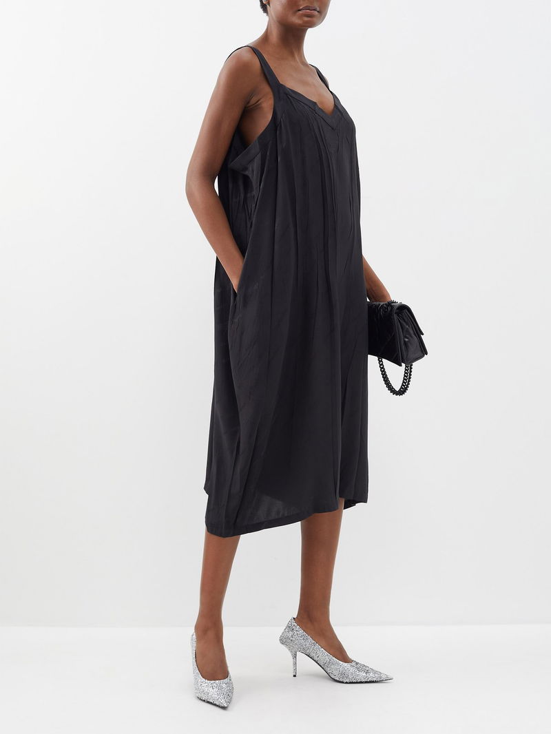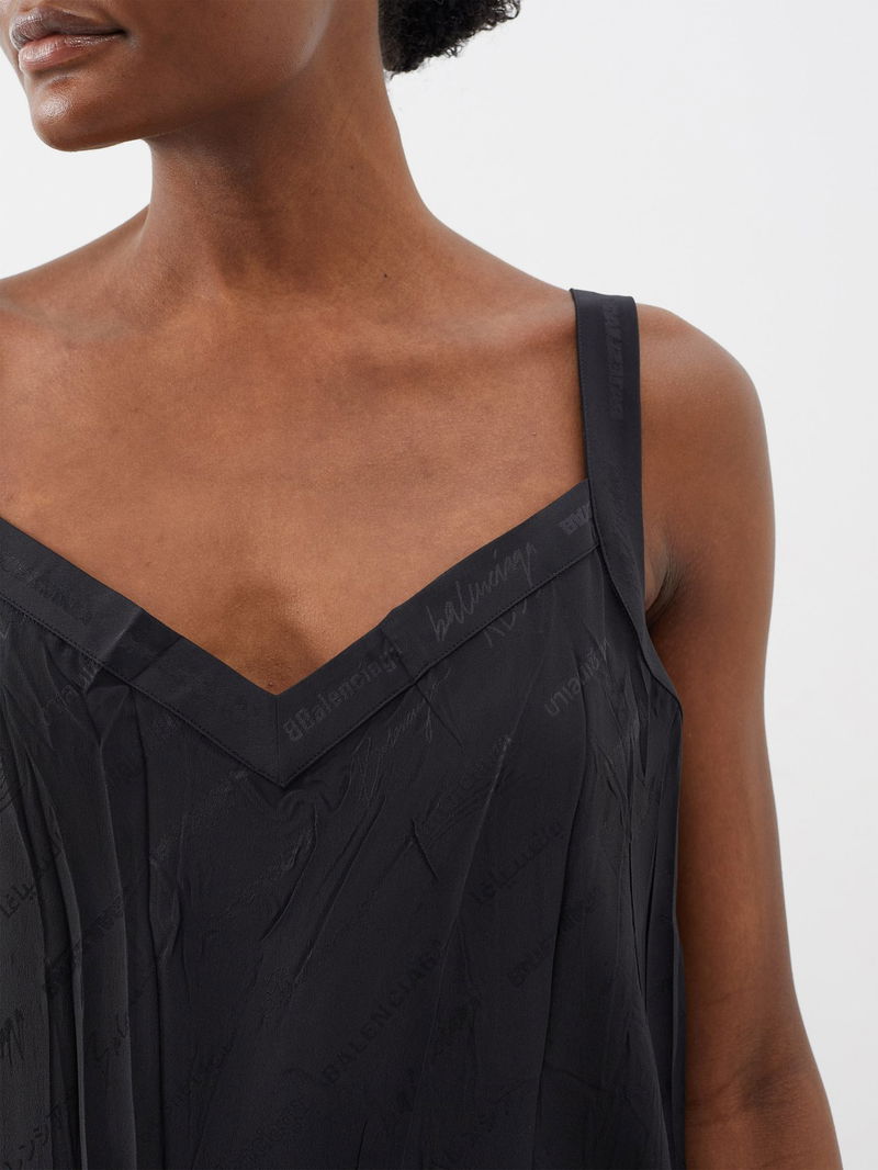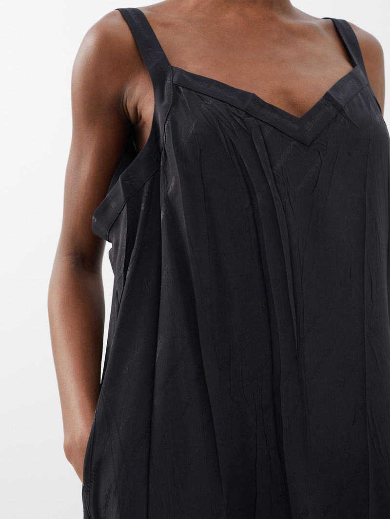 Balenciaga’s black midi dress is cut from silk to a generous shape and accented with different jacquard iterations of the label’s logo.