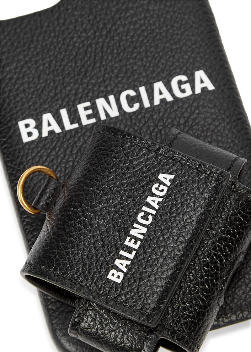 Balenciaga black leather iPhone 12 and Airpods case Comes with a detachable neck strap iPhone 12 case: logo print, brushed gold-tone hardware Airpods case: logo print, gold-tone hardware, press-stud fastening Presented in a designer-stamped box.