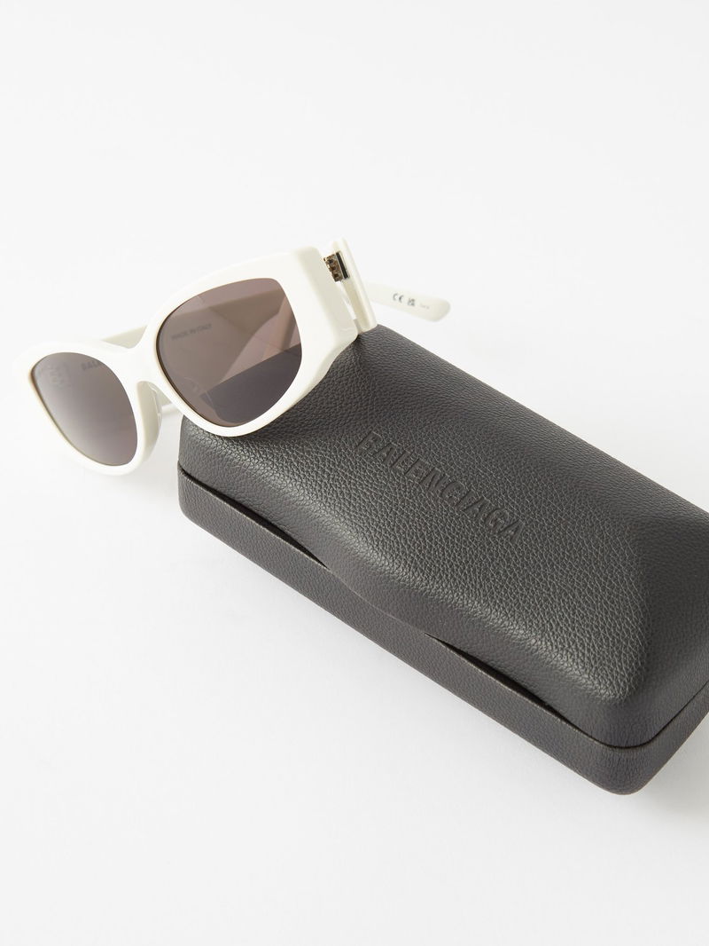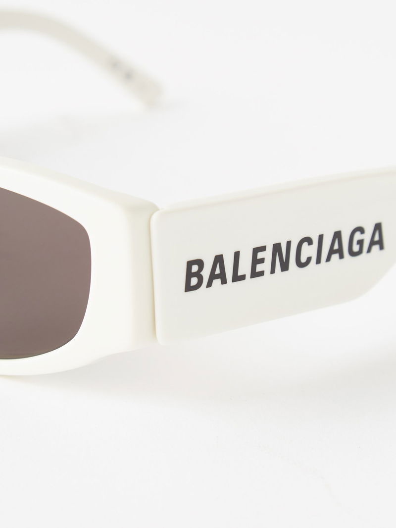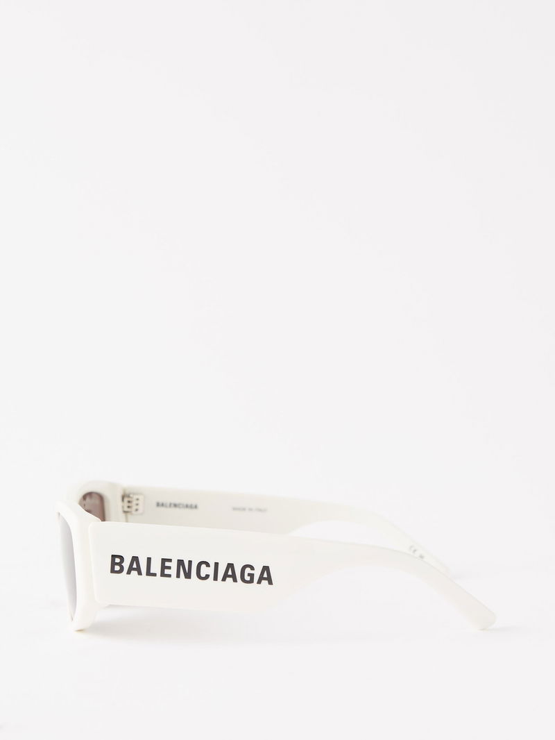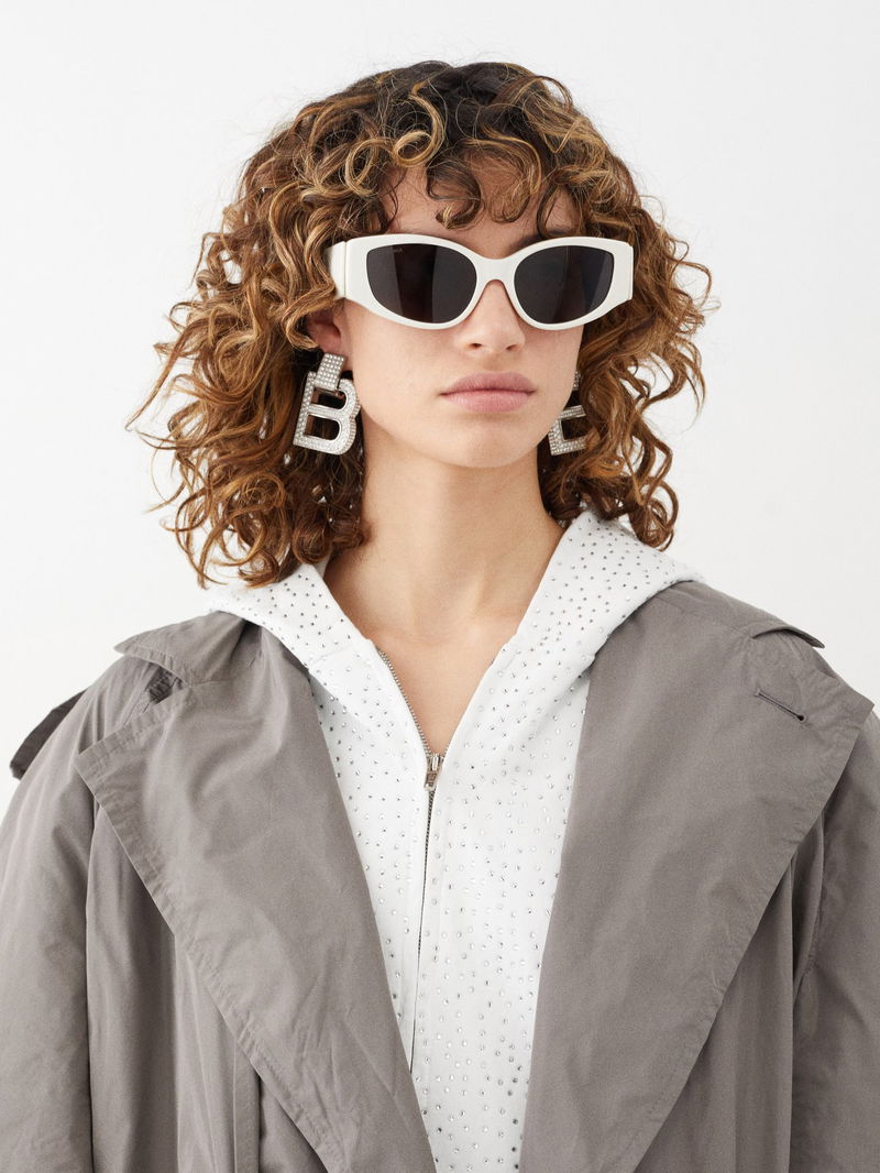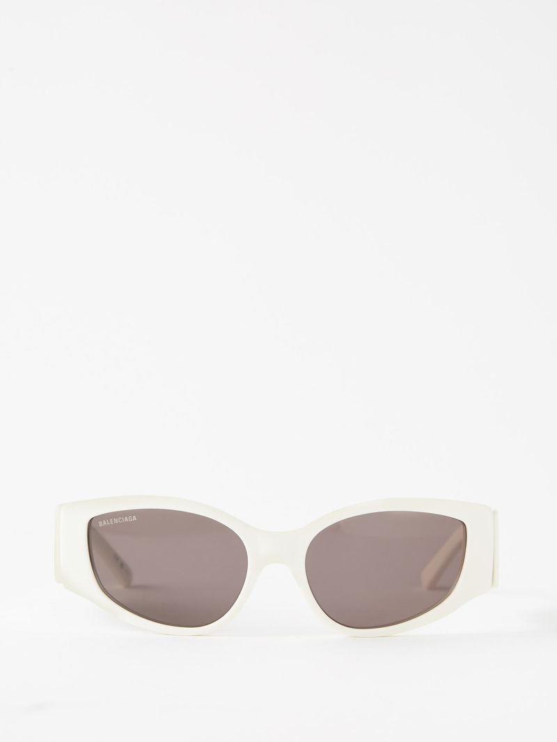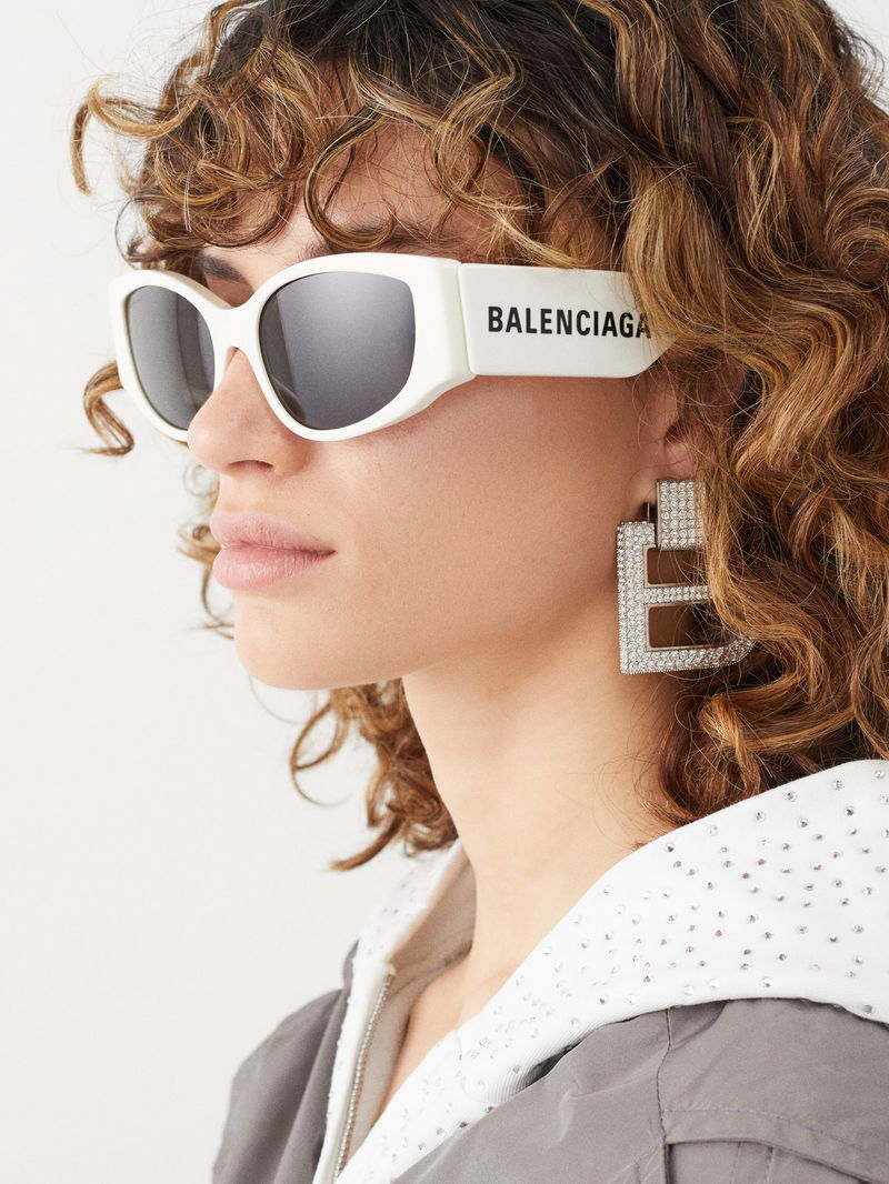 Futuristic-tinged eyewear is Balenciaga’s calling card, and these white acetate sunglasses are shaped with chunky oval frames, then hallmarked with an oversized black logo print.