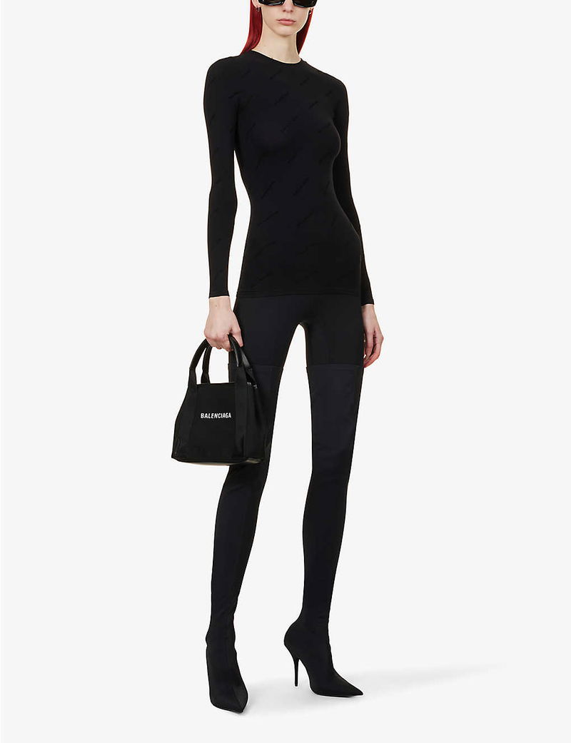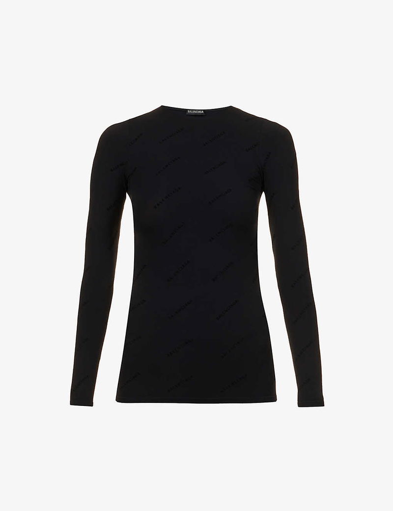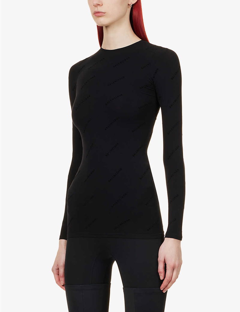When it comes to branding, Balenciaga's recent collections suggest the bolder, the better. But for SS23, the label's Creative Director Demna Gvasalia takes a somewhat subtler approach. The result? Modest offerings like this round-neck top. Spun from a stretch-infused fabric that provides a figure-hugging, second-skin fit, the long-sleeved style is then printed with a tonal rendition of the brand's signature monogram motif.