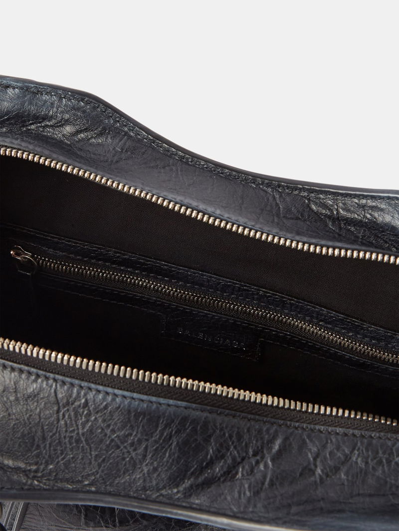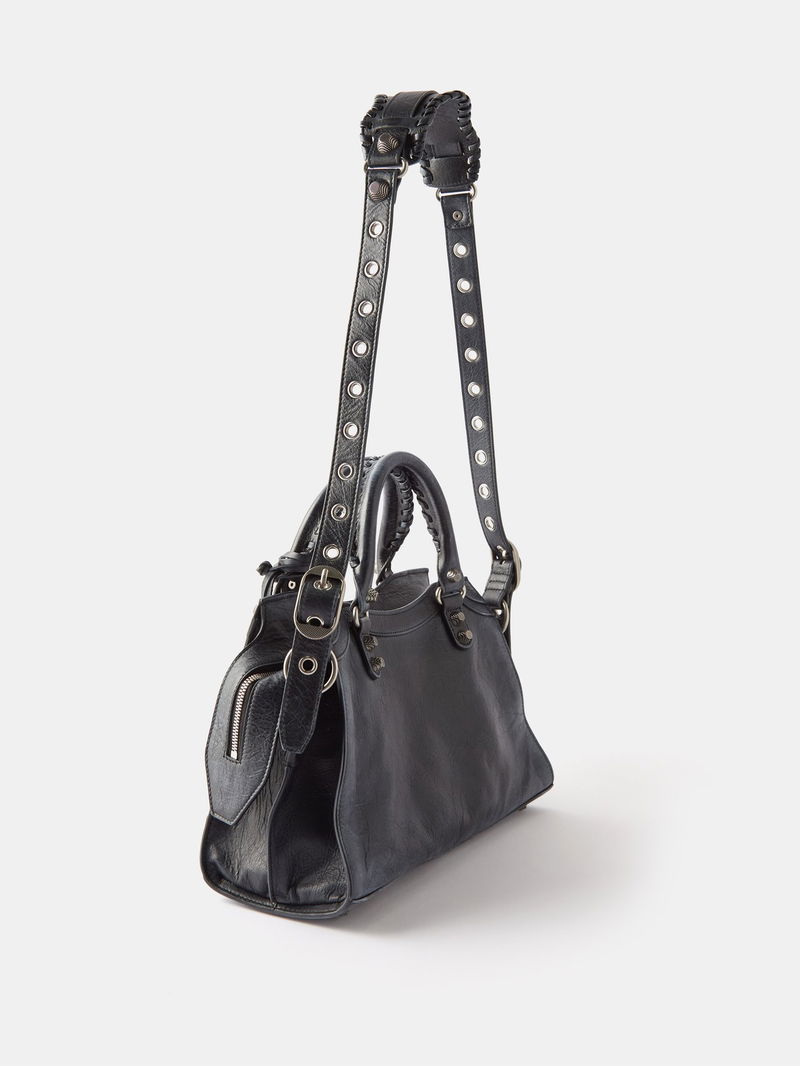 Balenciaga's Neo Cagole City bag is crafted from distressed black leather with biker-inspired hardware, a nod to the house's Moto silhouette launched in 2001.