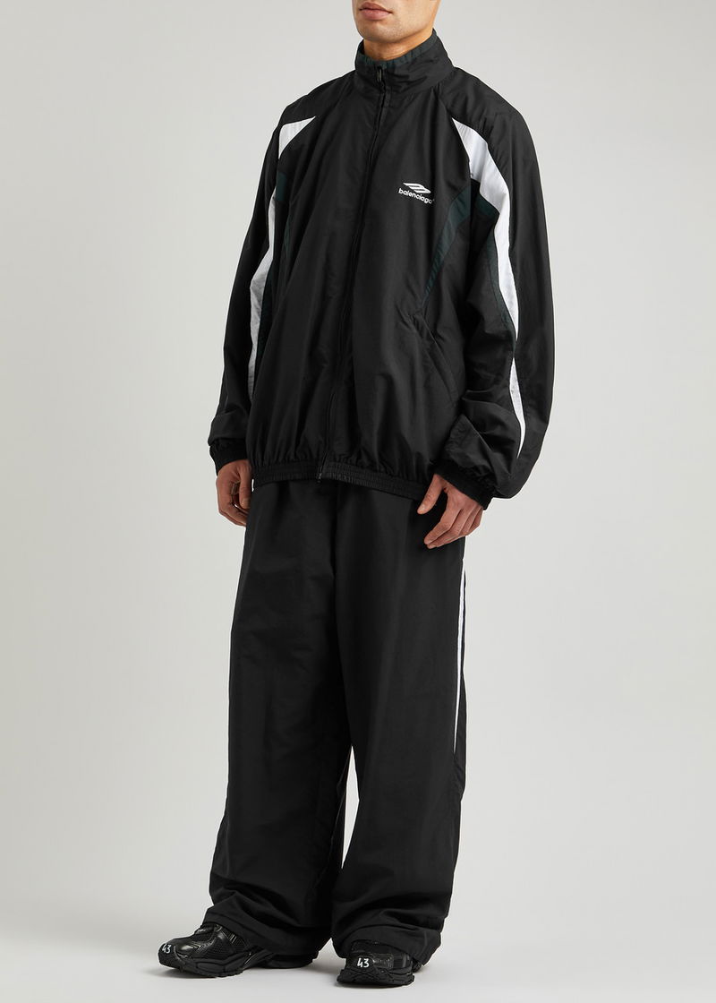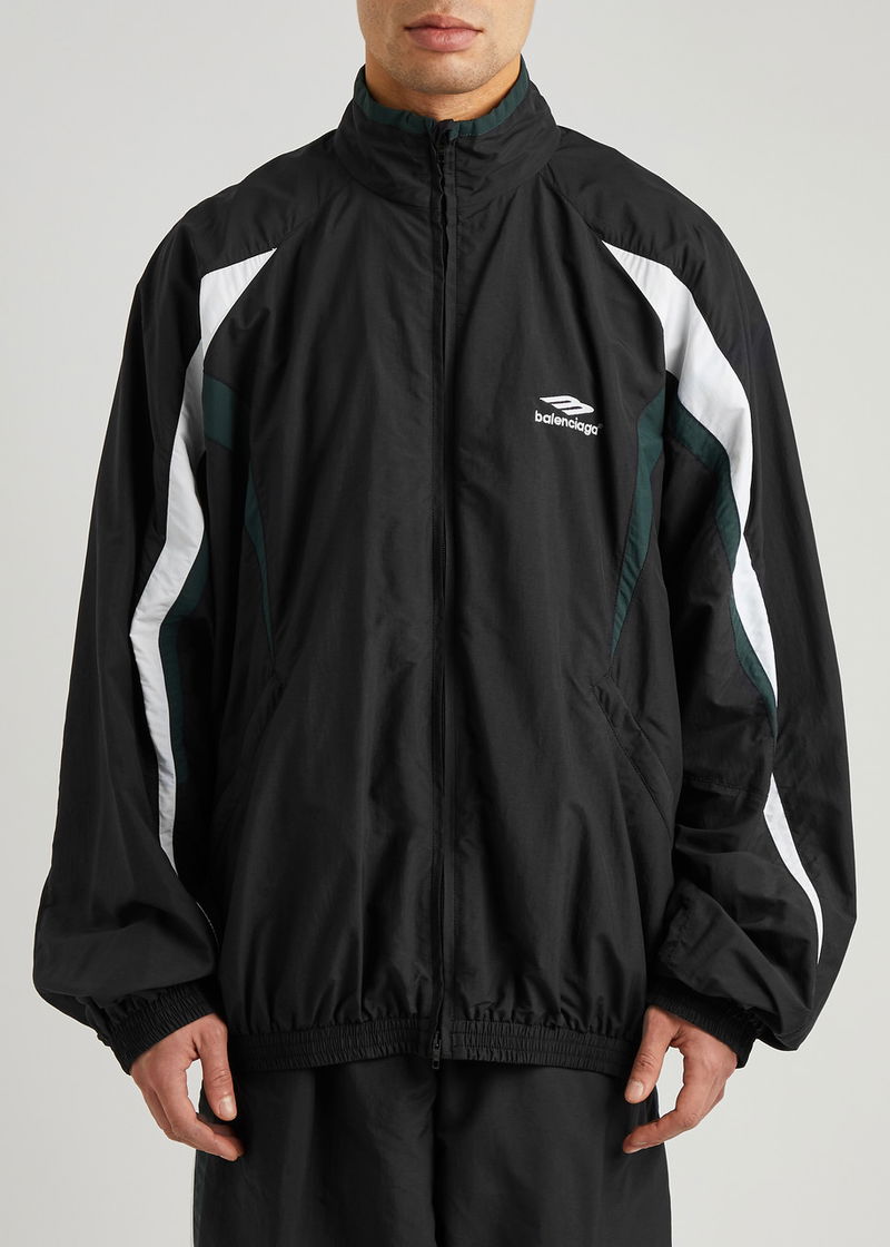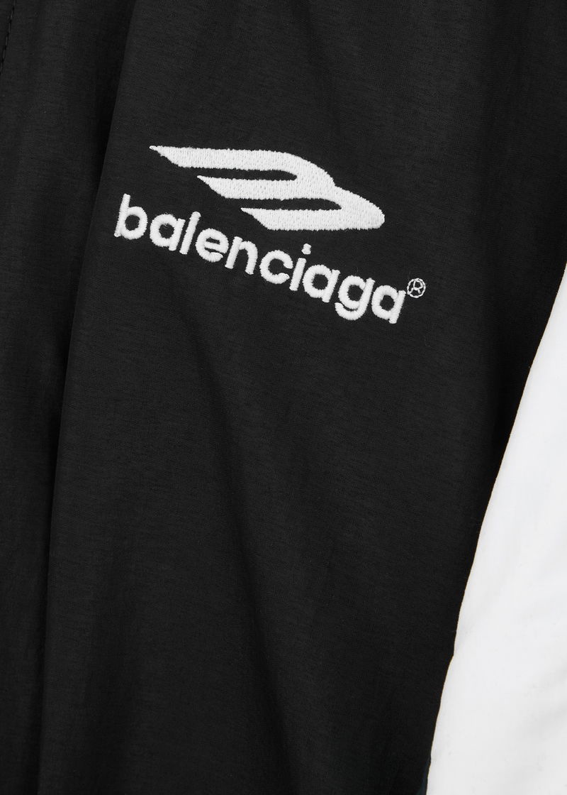 Balenciaga’s latest drop continues with the label’s fusion of oversized silhouettes and vintage sportswear-inspired pieces. Nodding to classic windbreaker styles, this shell track jacket is worked with striped panels and is decorated with an embroidered logo at the chest.