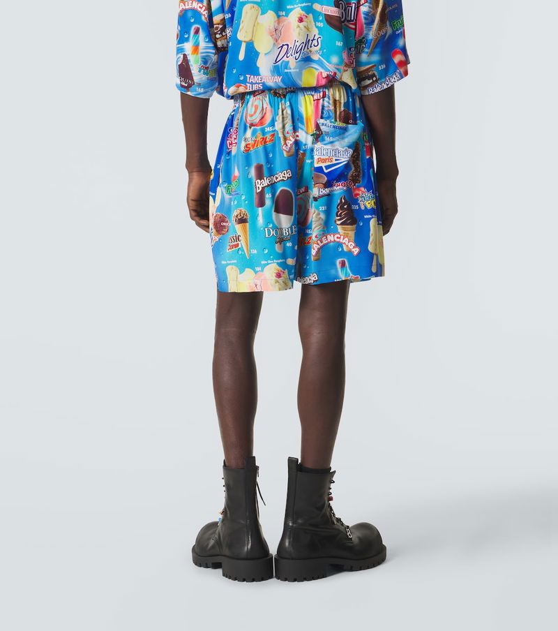 Balenciaga continues to push the boundaries of style. These satin shorts are made in Italy and feature a refreshing all-over print of ice-cream varieties on a blue backdrop.