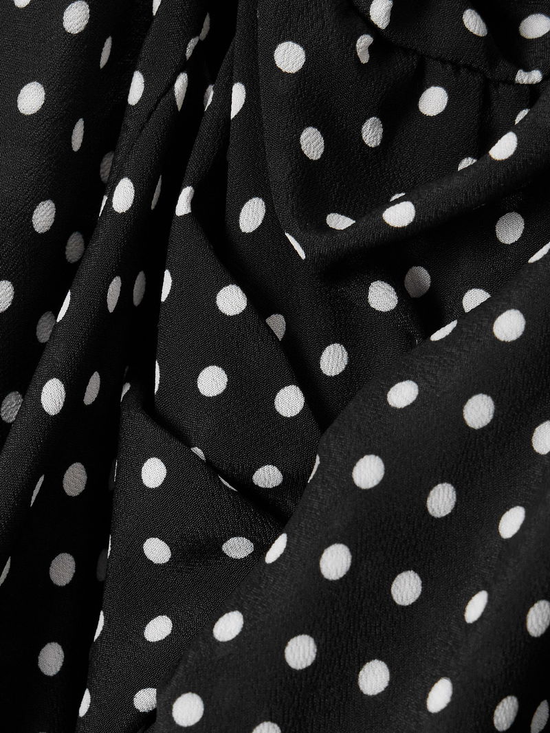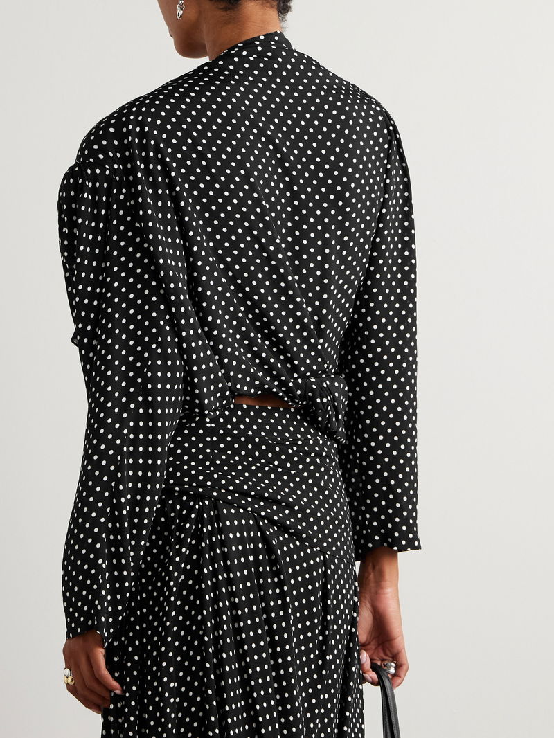 Balenciaga's Winter '25 collection reimagines classic dress codes in "inverted and twisted" ways. Made from polka-dot crepe de chine, this blouse has an asymmetric, deconstructed design with beautiful draping and puffed sleeves borrowed from vintage styles. Wear yours with the matching skirt from the collection.