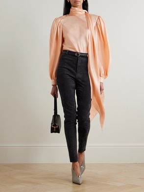 Balenciaga's vivid pink blouse was presented against the brooding backdrop of the AW20 runway show amongst draped attire inspired by Cristóbal Balenciaga's velvet designs for a Spanish Marquesa. Made from exquisite satin that's woven with a subtle newspaper jacquard and printed with graphic polka dots, it features dropped shoulder seams and an asymmetric collar complete with an elongated scarf which falls past the curved hem. Recall the season's styling by teaming it with a pleated skirt and leather pumps.