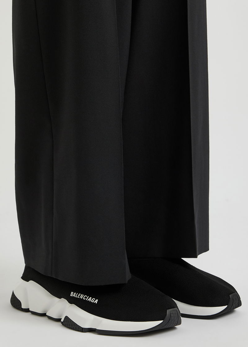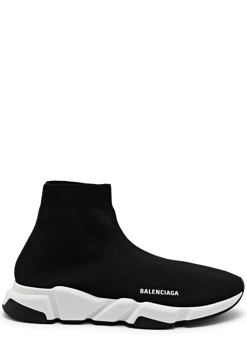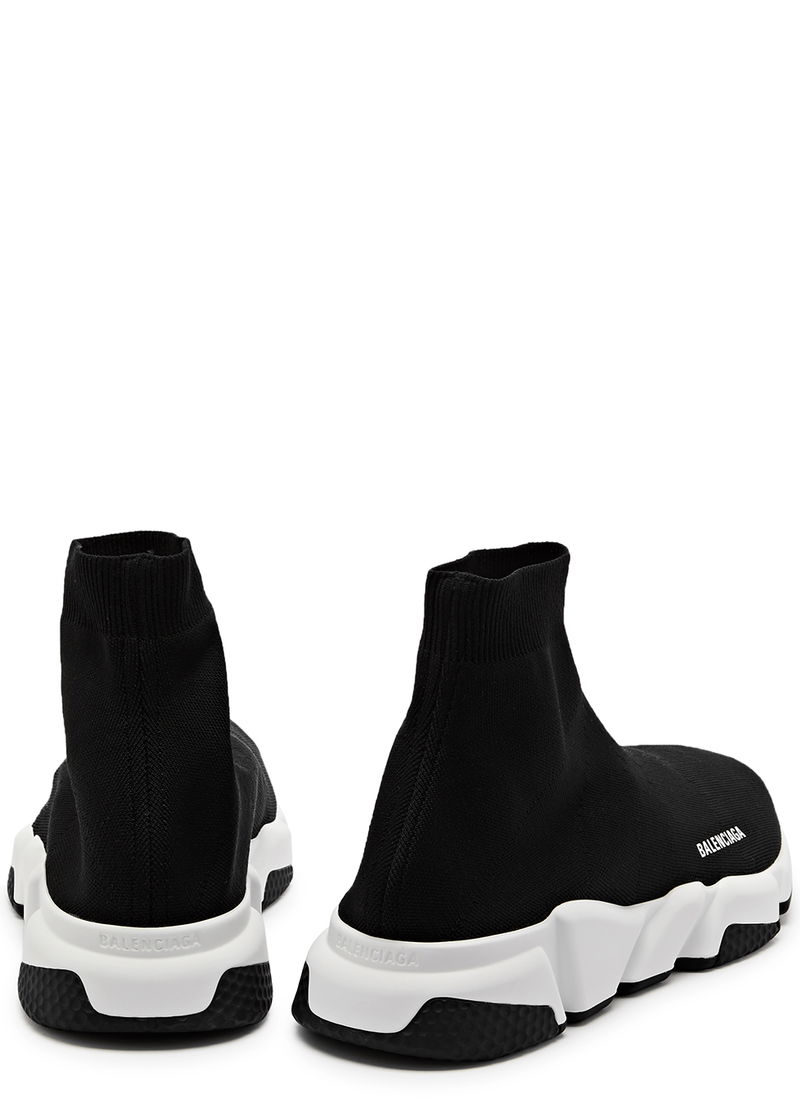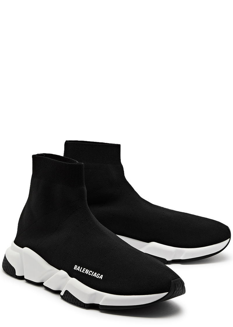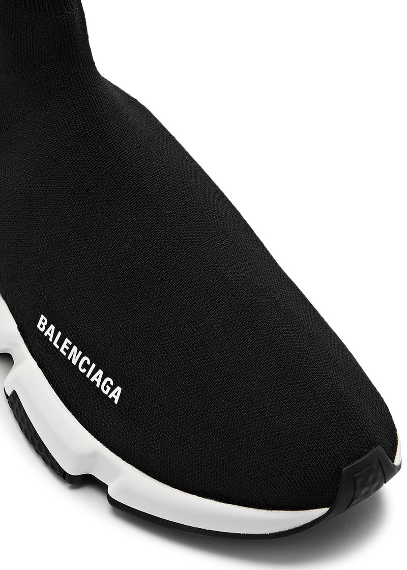 Balenciaga stretch-knit sneakers. Sculpted sole measures approximately 1.5 inches/ 40mm. Ribbed cuff, designer stamp, rubber sole, round toe. Pull on.